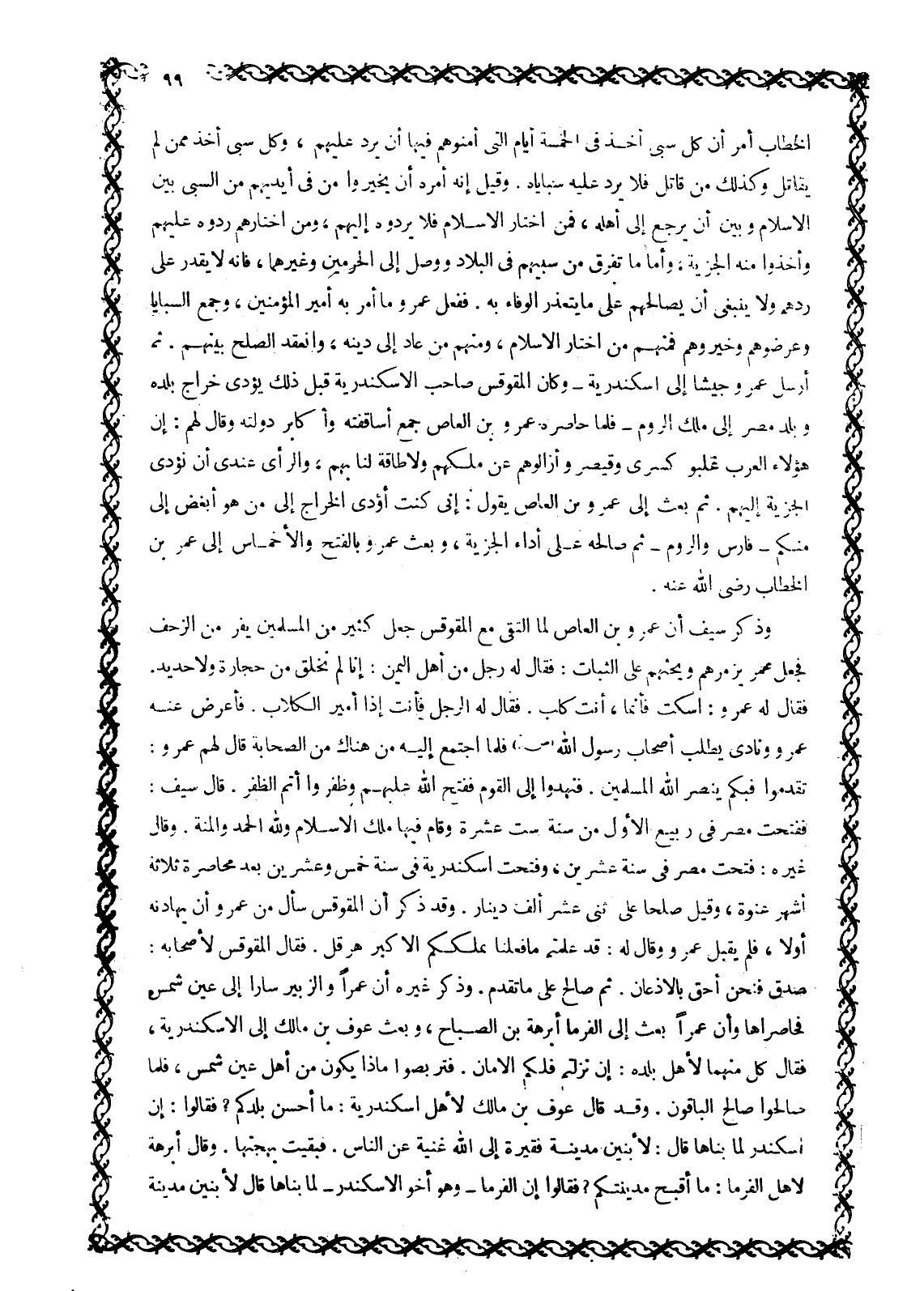 الْخَطَّابِ أَمَرَ أَنَّ كُلَّ سَبْيٍ أُخِذَ فِي الْخَمْسَةِ أَيَّامٍ الَّتِي أَمَّنُوهُمْ فِيهَا أَنْ يُرَدَّ عَلَيْهِمْ، وَكُلَّ سَبْيٍ أُخِذَ مِمَّنْ لَمْ يُقَاتِلْ وَكَذَلِكَ مَنْ قَاتَلَ فَلَا يُرَدُّ عَلَيْهِ سَبَايَاهُ. وَقِيلَ إِنَّهُ أَمَرَهُ أَنْ يُخَيِّرُوا مَنْ فِي أَيْدِيهِمْ مِنَ السَّبْيِ بَيْنَ الْإِسْلَامِ وَبَيْنَ أَنْ يَرْجِعَ إِلَى أَهْلِهِ، فَمَنِ اخْتَارَ الْإِسْلَامَ فَلَا يَرُدُّوهُ إِلَيْهِمْ، وَمَنِ اخْتَارَهُمْ رَدُّوهُ عَلَيْهِمْ وَأَخَذُوا مِنْهُ الْجِزْيَةَ، وَأَمَّا مَا تَفَرَّقَ مِنْ سَبْيِهِمْ فِي الْبِلَادِ وَوَصَلَ إِلَى الْحَرَمَيْنِ وَغَيْرِهِمَا، فَإِنَّهُ لَا يَقْدِرُ عَلَى رَدِّهِمْ وَلَا يَنْبَغِي أَنْ يُصَالِحَهُمْ عَلَى مَا يَتَعَذَّرُ الْوَفَاءُ بِهِ. فَفَعَلَ عَمْرٌو مَا أَمَرَ بِهِ أَمِيرُ الْمُؤْمِنِينَ، وَجَمَعَ السَّبَايَا وَعَرَضُوهُمْ وَخَيَّرُوهُمْ فَمِنْهُمْ مَنِ اخْتَارَ الْإِسْلَامَ، وَمِنْهُمْ مَنْ عَادَ إِلَى دِينِهِ، وَانْعَقَدَ الصُّلْحُ بَيْنَهُمْ. ثُمَّ أَرْسَلَ عَمْرٌو جَيْشًا إِلَى إِسْكَنْدَرِيَّةَ- وَكَانَ الْمُقَوْقِسُ صَاحِبُ الْإِسْكَنْدَرِيَّةِ قَبْلَ ذَلِكَ يُؤَدِّي خَرَاجَ بَلَدِهِ وَبَلَدِ مِصْرَ إِلَى مَلِكِ الرُّومِ- فَلَمَّا حَاصَرَهُ عَمْرُو بْنُ الْعَاصِ جَمَعَ أَسَاقِفَتَهُ وَأَكَابِرَ دَوْلَتِهِ وَقَالَ لَهُمْ: إِنَّ هَؤُلَاءِ الْعَرَبَ غَلَبُوا كِسْرَى وَقَيْصَرَ وَأَزَالُوهُمْ عَنْ مُلْكِهِمْ وَلَا طَاقَةَ لَنَا بِهِمْ، وَالرَّأْيُ عِنْدِي أَنْ نُؤَدِّيَ الْجِزْيَةَ إِلَيْهِمْ. ثُمَّ بَعَثَ إِلَى عَمْرِو بْنِ الْعَاصِ يَقُولُ: إِنِّي كُنْتُ أُؤَدِّي الْخَرَاجَ إِلَى مَنْ هُوَ أَبْغَضُ إِلَيَّ مِنْكُمْ- فَارِسَ وَالرُّومِ- ثُمَّ صَالَحَهُ عَلَى أَدَاءِ الْجِزْيَةِ، وَبَعَثَ عَمْرٌو بِالْفَتْحِ وَالْأَخْمَاسِ إِلَى عُمَرَ بْنِ الْخَطَّابِ رَضِيَ اللَّهُ عَنْهُ.