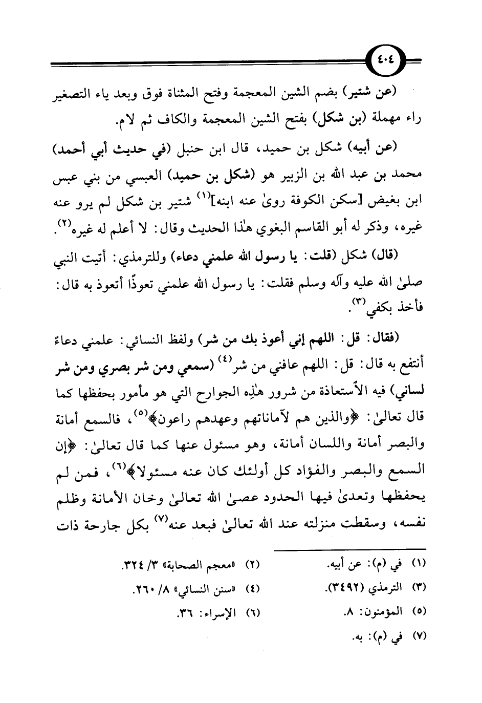(فقال: قل: اللهم إني أعوذ بك من شر) ولفظ النسائي: علمني دعاءً أنتفع به قال: قل: اللهم عافني من شر (¬4) (سمعي ومن شر بصري ومن شر لساني) فيه الاستعاذة من شرور هذِه الجوارح التي هو مأمور بحفظها كما قال تعالى: {وَالَّذِينَ هُمْ لِأَمَانَاتِهِمْ وَعَهْدِهِمْ رَاعُونَ} (¬5)، فالسمع أمانة والبصر أمانة واللسان أمانة، وهو مسئول عنها كما قال تعالى: {إِنَّ السَّمْعَ وَالْبَصَرَ وَالْفُؤَادَ كُلُّ أُولَئِكَ كَانَ عَنْهُ مَسْئُولًا} (¬6)، فمن لم يحفظها وتعدى فيها الحدود عصى الله تعالى وخان الأمانة وظلم نفسه، وسقطت منزلته عند الله تعالى فبعد عنه (¬7) بكل جارحة ذات