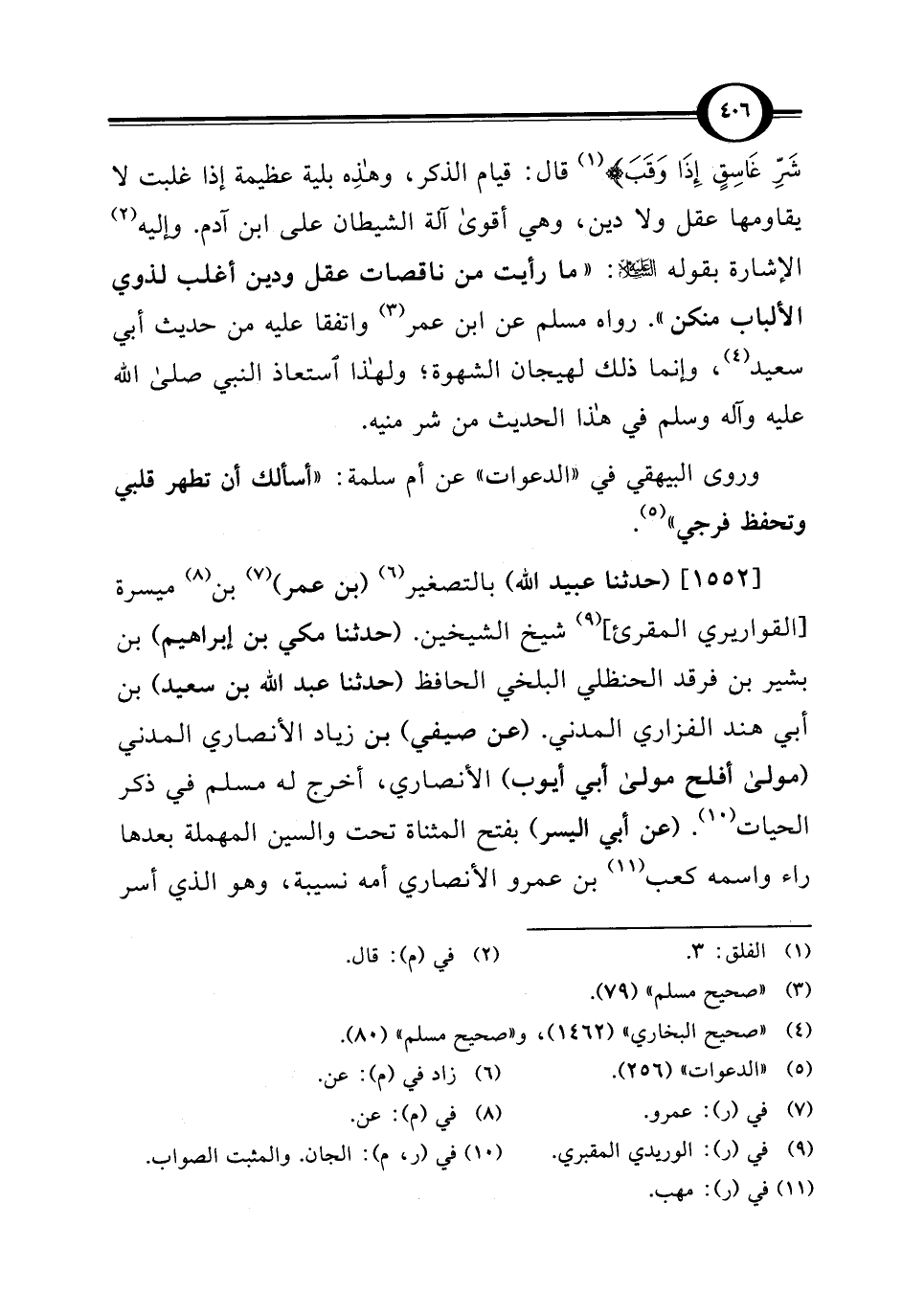 شَرِّ غَاسِقٍ إِذَا وَقَبَ} (¬1) قال: قيام الذكر، وهذِه بلية عظيمة إذا غلبت لا يقاومها عقل ولا دين، وهي أقوى آلة الشيطان على ابن آدم. وإليه (¬2) الإشارة بقوله - عليه السلام -: "ما رأيت من ناقصات عقل ودين أغلب لذوي الألباب منكن". رواه مسلم عن ابن عمر (¬3) واتفقا عليه من حديث أبي سعيد (¬4)، وإنما ذلك لهيجان الشهوة؛ ولهذا استعاذ النبي صلى الله عليه وآله وسلم في هذا الحديث من شر منيه.