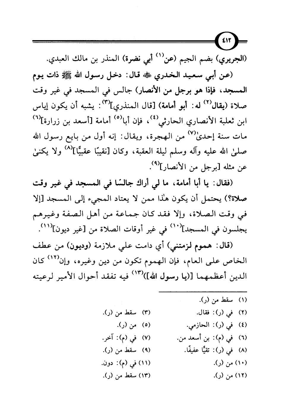 (عن أبي سعيد الخدري - رضي الله عنه - قال: دخل رسول الله - صلى الله عليه وسلم - ذات يوم المسجد، فإذا هو برجل من الأنصار) جالس في المسجد في غير وقت صلاة (يقال (¬2) له: أبو أمامة) [قال المنذري] (¬3): يشبه أن يكون إياس بن ثعلبة الأنصاري الحارثي (¬4)، فإن أبا (¬5) أمامة [أسعد بن زرارة] (¬6) مات سنة إحدى (¬7) من الهجرة، ويقال: إنه أول من بايع رسول الله صلى الله عليه وآله وسلم ليلة العقبة، وكان [نقيبًا عقبيًّا] (¬8) ولا يكنى عن مثله [برجل من الأنصار] (¬9).