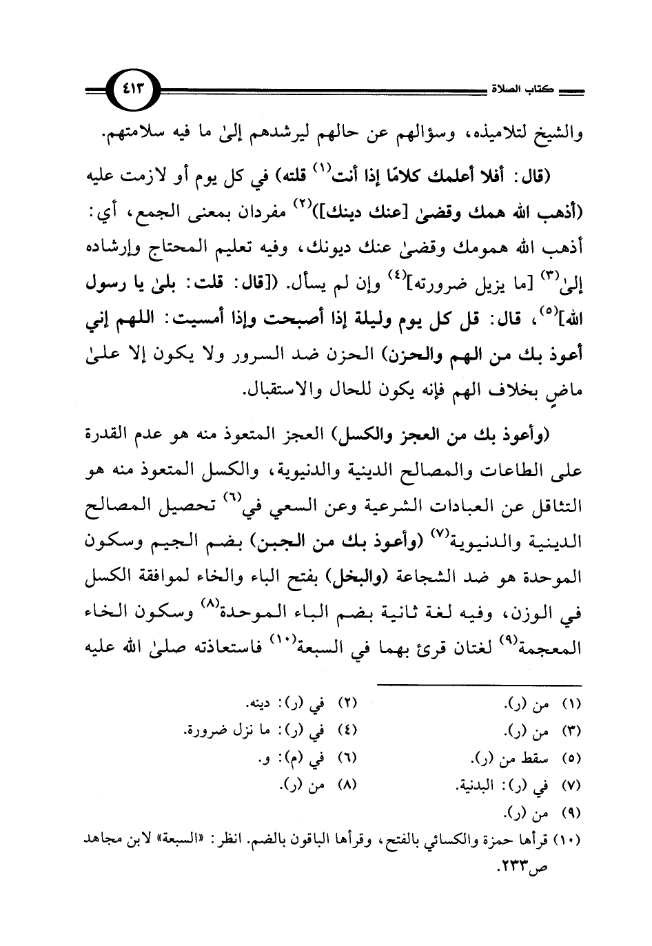 (وأعوذ بك من العجز والكسل) العجز المتعوذ منه هو عدم القدرة على الطاعات والمصالح الدينية والدنيوية، والكسل المتعوذ منه هو التثاقل عن العبادات الشرعية وعن السعي في (¬6) تحصيل المصالح الدينية والدنيوية (¬7) (وأعوذ بك من الجبن) بضم الجيم وسكون الموحدة هو ضد الشجاعة (والبخل) بفتح الباء والخاء لموافقة الكسل في الوزن، وفيه لغة ثانية بضم الباء الموحدة (¬8) وسكون الخاء المعجمة (¬9) لغتان قرئ بهما في السبعة (¬10) فاستعاذته صلى الله عليه