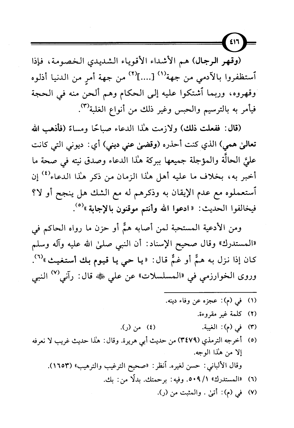 (وقهر الرجال) هم الأشداء الأقوياء الشديدي الخصومة، فإذا استظفروا بالآدمي من جهة (¬1) [. . . .] (¬2) من جهة أمرٍ من الدنيا أذلوه وقهروه، وربما اشتكوا عليه إلى الحكام وهم ألحن منه في الحجة فيأمر به بالترسيم والحبس وغير ذلك من أنواع الغلبة (¬3).