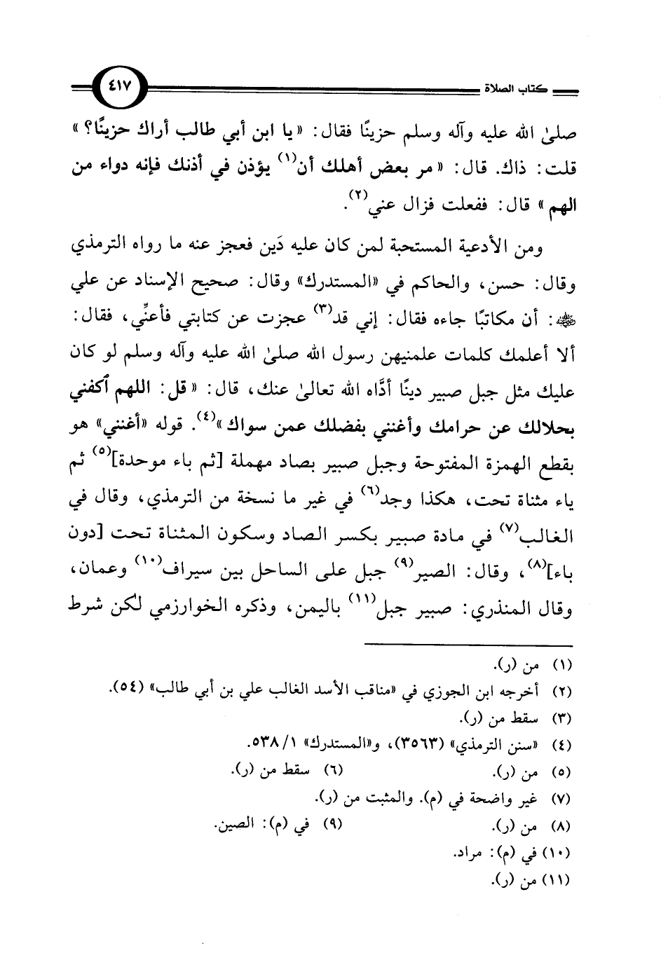 ومن الأدعية المستحبة لمن كان عليه دَين فعجز عنه ما رواه الترمذي وقال: حسن، والحاكم في "المستدرك" وقال: صحيح الإسناد عن علي - رضي الله عنه -: أن مكاتبًا جاءه فقال: إني قد (¬3) عجزت عن كتابتي فأعنِّي، فقال: ألا أعلمك كلمات علمنيهن رسول الله صلى الله عليه وآله وسلم لو كان عليك مثل جبل صبير دينًا أدَّاه الله تعالى عنك، قال: "قل: اللهم اكفني بحلالك عن حرامك وأغنني بفضلك عمن سواك" (¬4). قوله "أغنني" هو بقطع الهمزة المفتوحة وجبل صبير بصاد مهملة [ثم باء موحدة] (¬5) ثم ياء مثناة تحت، هكذا وجد (¬6) في غير ما نسخة من الترمذي، وقال في الغالب (¬7) في مادة صبير بكسر الصاد وسكون المثناة تحت [دون باء] (¬8)، وقال: الصير (¬9) جبل على الساحل بين سيراف (¬10) وعمان، وقال المنذري: صبير جبل (¬11) باليمن، وذكره الخوارزمي لكن شرط