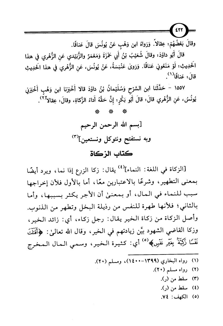 1557 - حَدَّثَنا ابن السَّرْحِ وَسُلَيْمانُ بْنُ دَاوُدَ قالا أَخْبَرَنا ابن وَهْبٍ أَخْبَرَني يُونُسُ، عَنِ الزُّهْري قَالَ: قَالَ أَبُو بَكْرٍ: إِنَّ حَقَّهُ أَداءُ الزَّكاةِ، وقَالَ: عِقالًا (¬2).