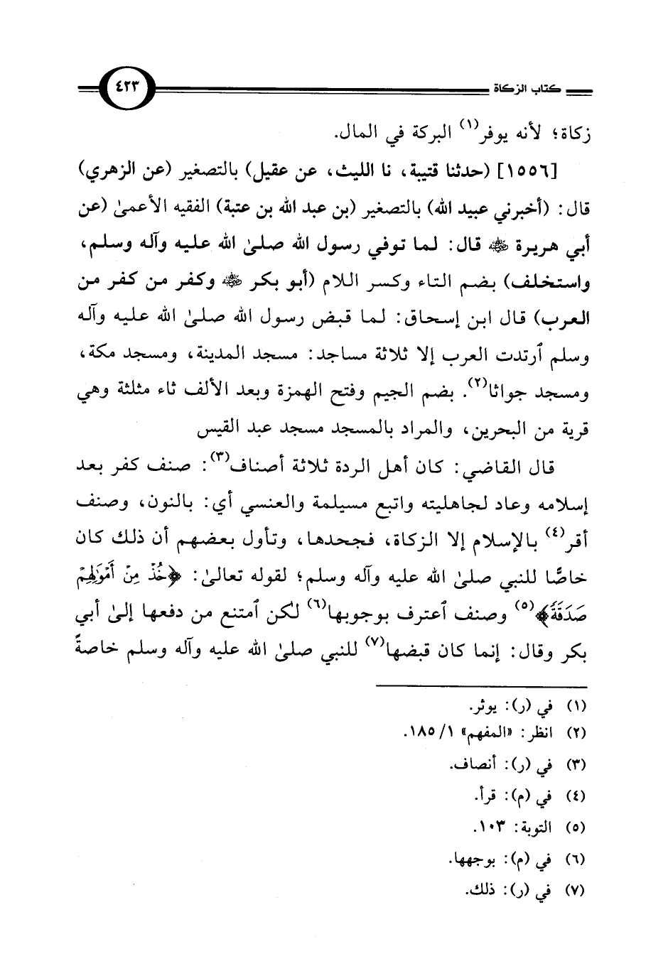 [1556] (حدثنا قتيبة، نا الليث، عن عقيل) بالتصغير (عن الزهري) قال: (أخبرني عبيد الله) بالتصغير (بن عبد الله بن عتبة) الفقيه الأعمى (عن أبي هريرة - رضي الله عنه - قال: لما توفي رسول الله صلى الله عليه وآله وسلم، واستخلف) بضم التاء وكسر اللام (أبو بكر - رضي الله عنه - وكفر من كفر من العرب) قال ابن إسحاق: لما قبض رسول الله صلى الله عليه وآله وسلم ارتدت العرب إلا ثلاثة مساجد: مسجد المدينة، ومسجد مكة، ومسجد جواثا (¬2). بضم الجيم وفتح الهمزة وبعد الألف ثاء مثلثة وهي قرية من البحرين، والمراد بالمسجد مسجد عبد القيس