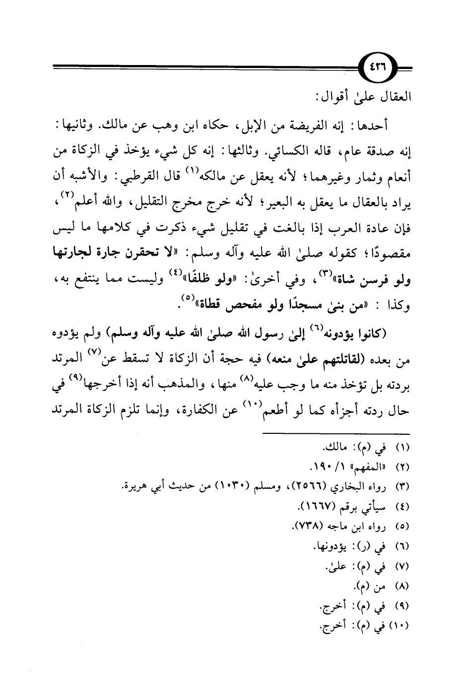 أحدها: إنه الفريضة من الإبل، حكاه ابن وهب عن مالك. وثانيها: إنه صدقة عام، قاله الكسائي. وثالثها: إنه كل شيء يؤخذ في الزكاة من أنعام وثمار وغيرهما؛ لأنه يعقل عن مالكه (¬1) قال القرطبي: والأشبه أن يراد بالعقال ما يعقل به البعير؛ لأنه خرج مخرج التقليل، والله أعلم (¬2)، فإن عادة العرب إذا بالغت في تقليل شيء ذكرت في كلامها ما ليس مقصودًا؛ كقوله صلى الله عليه وآله وسلم: "لا تحقرن جارة لجارتها ولو فرسن شاة" (¬3)، وفي أخرى: "ولو ظلفًا" (¬4) وليست مما ينتفع به، وكذا: "من بنى مسجدًا ولو مفحص قطاة" (¬5).