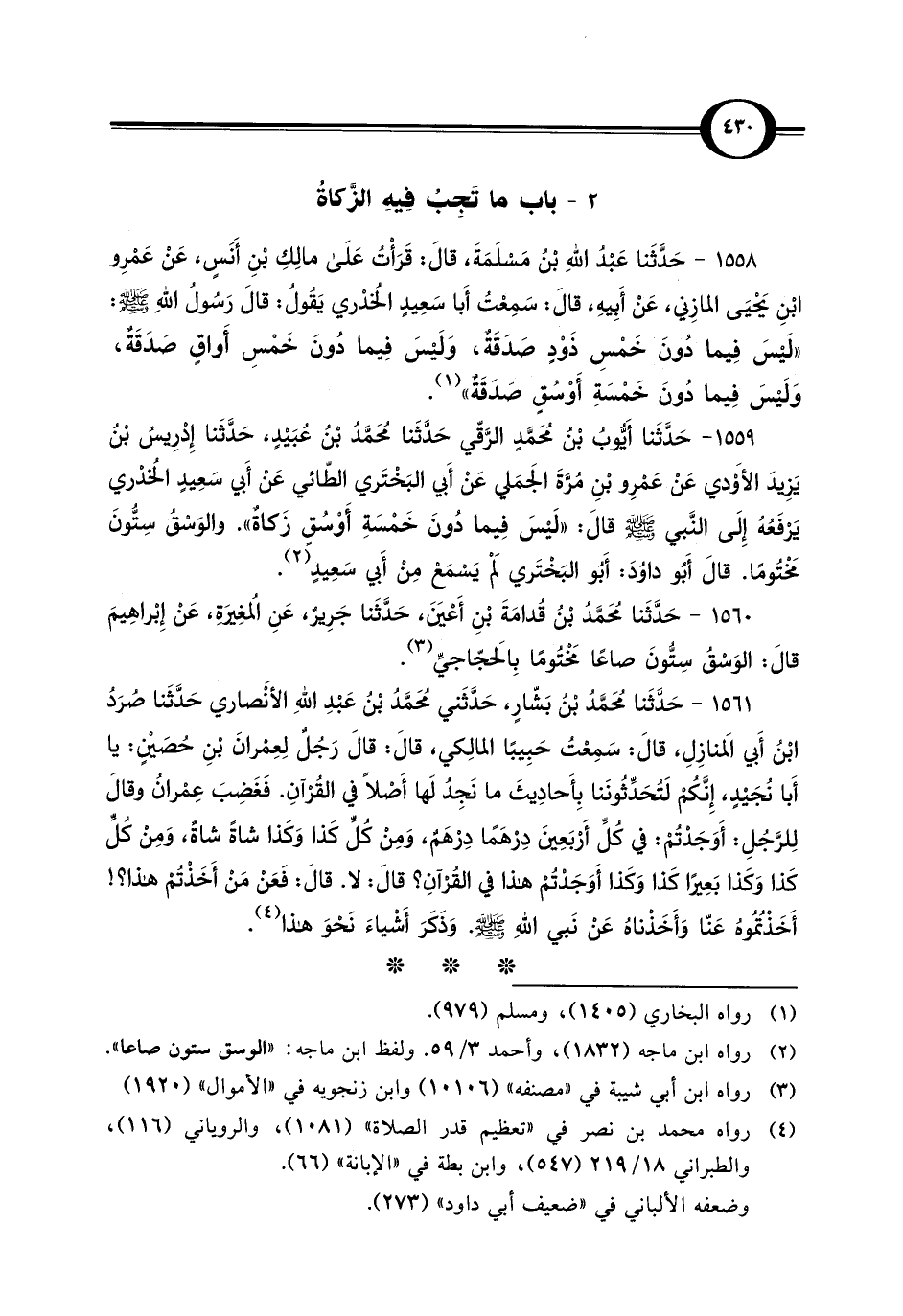 1558 - حَدَّثَنا عَبْدُ اللهِ بْنُ مَسْلَمَةَ، قَالَ: قَرَأْتُ عَلَى مالِكِ بْنِ أَنَسٍ، عَنْ عَمْرِو بْنِ يَحْيَى المازِني، عَنْ أَبِيهِ، قَالَ: سَمِعْتُ أَبا سَعِيدٍ الخُدْري يَقُولُ: قَالَ رَسُولُ اللهِ - صلى الله عليه وسلم -: "لَيْسَ فِيما دُونَ خَمْسِ ذَوْدٍ صَدَقَةٌ، وَلَيْسَ فِيما دُونَ خَمْسِ أَواقٍ صَدَقَةٌ، وَلَيْسَ فِيما دُونَ خَمْسَةِ أَوْسُقٍ صَدَقَةٌ" (¬1).