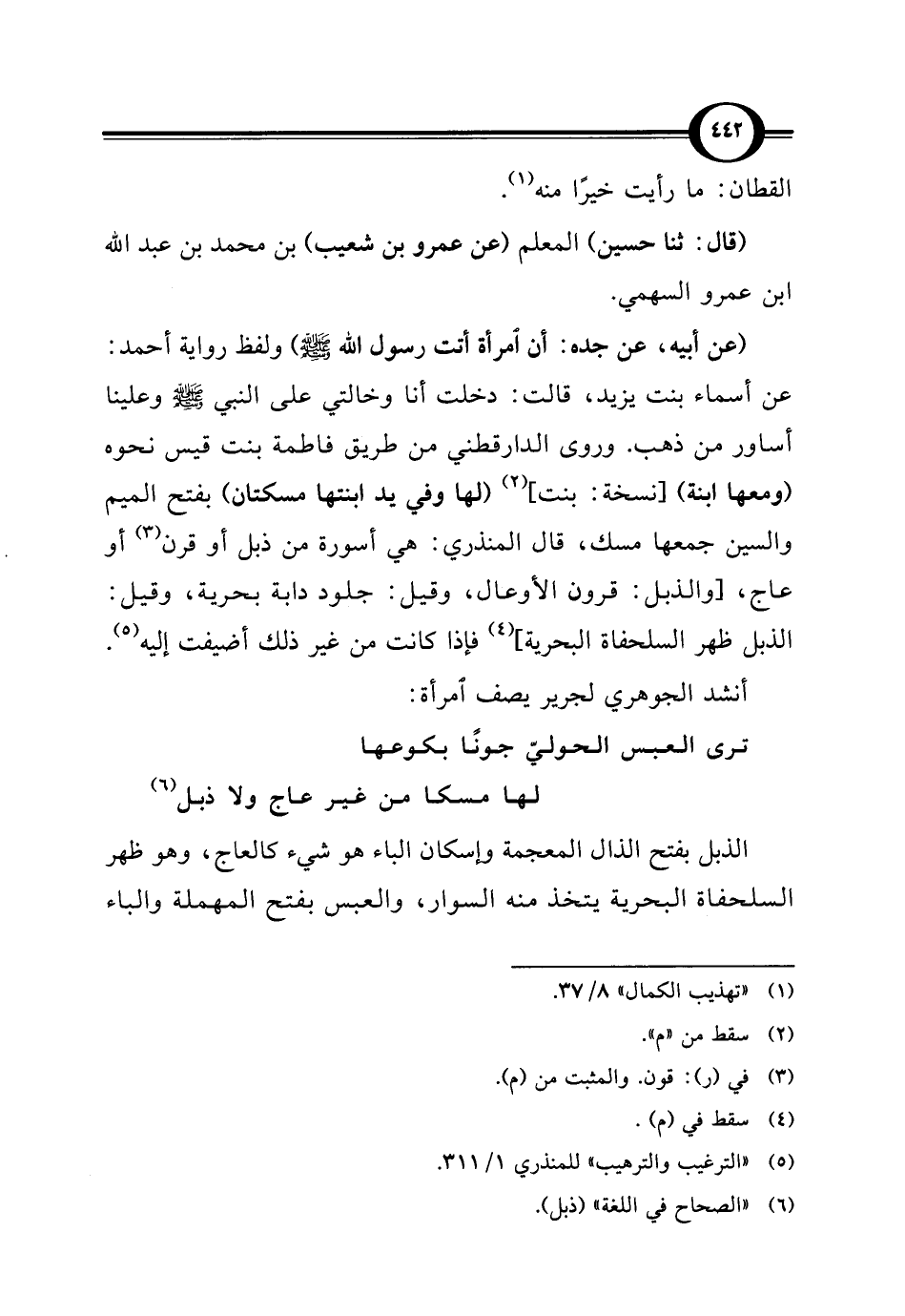 (عن أبيه، عن جده: أن امرأة أتت رسول الله - صلى الله عليه وسلم -) ولفظ رواية أحمد: عن أسماء بنت يزيد، قالت: دخلت أنا وخالتي على النبي - صلى الله عليه وسلم - وعلينا أساور من ذهب. وروى الدارقطني من طريق فاطمة بنت قيس نحوه (ومعها ابنة) [نسخة: بنت] (¬2) (لها وفي يد ابنتها مسكتان) بفتح الميم والسين جمعها مسك، قال المنذري: هي أسورة من ذبل أو قرن (¬3) أو عاج، [والذبل: قرون الأوعال، وقيل: جلود دابة بحرية، وقيل: الذبل ظهر السلحفاة البحرية] (¬4) فإذا كانت من غير ذلك أضيفت إليه (¬5).