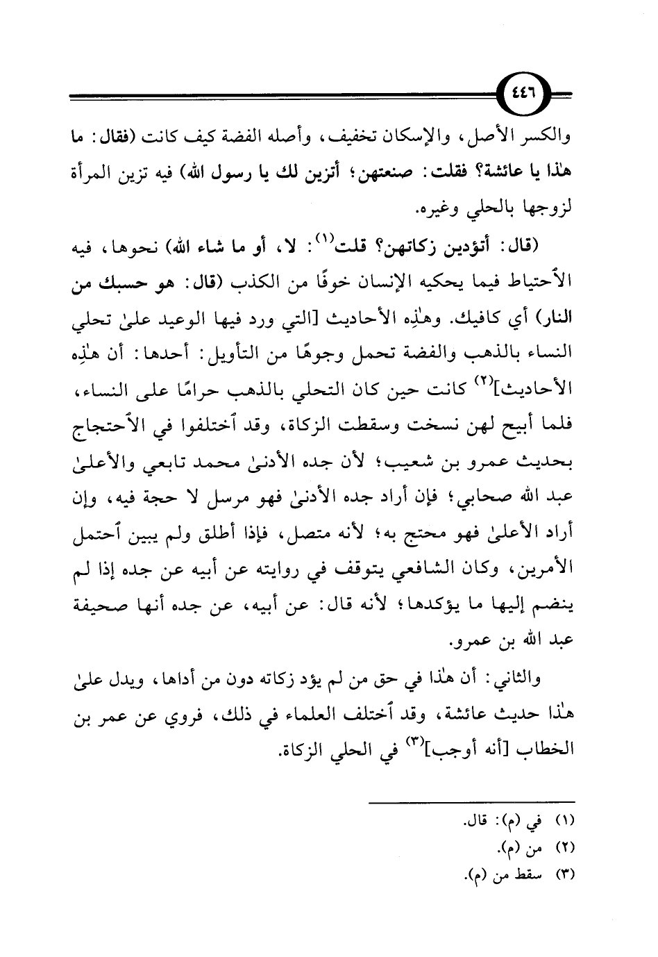 (قال: أتؤدين زكاتهن؟ قلت (¬1): لا، أو ما شاء الله) نحوها، فيه الاحتياط فيما يحكيه الإنسان خوفًا من الكذب (قال: هو حسبك من النار) أي كافيك. وهذِه الأحاديث [التي ورد فيها الوعيد على تحلي النساء بالذهب والفضة تحمل وجوهًا من التأويل: أحدها: أن هذِه الأحاديث] (¬2) كانت حين كان التحلي بالذهب حرامًا على النساء، فلما أبيح لهن نسخت وسقطت الزكاة، وقد اختلفوا في الاحتجاج بحديث عمرو بن شعيب؛ لأن جده الأدنى محمد تابعي والأعلى عبد الله صحابي؛ فإن أراد جده الأدنى فهو مرسل لا حجة فيه، وإن أراد الأعلى فهو محتج به؛ لأنه متصل، فإذا أطلق ولم يبين احتمل الأمرين، وكان الشافعي يتوقف في روايته عن أبيه عن جده إذا لم ينضم إليها ما يؤكدها؛ لأنه قال: عن أبيه، عن جده أنها صحيفة عبد الله بن عمرو.