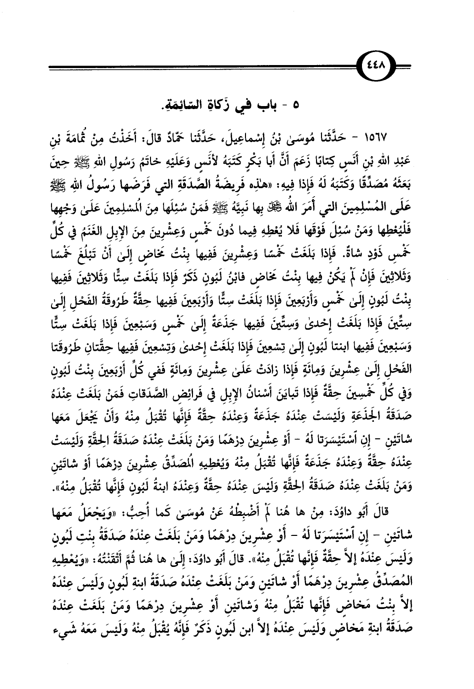 1567 - حَدَّثَنا مُوسَى بْنُ إِسْماعِيلَ، حَدَّثَنا حَمّادٌ قَالَ: أَخَذْتُ مِنْ ثُمامَةَ بْنِ عَبْدِ اللهِ بْنِ أَنَسٍ كِتابًا زَعَمَ أَنَّ أَبا بَكْرٍ كَتَبَهُ لأَنَسٍ وَعَلَيْهِ خاتَمُ رَسُولِ اللهِ - صلى الله عليه وسلم - حِينَ بَعَثَهُ مُصَدِّقًا وَكَتَبَهُ لَهُ فَإِذَا فِيهِ: "هذِه فَرِيضَةُ الصَّدَقَةِ التي فَرَضَها رَسُولُ اللهِ - صلى الله عليه وسلم - عَلَى المُسْلِمِينَ التي أَمَرَ اللهُ - عز وجل - بِها نَبِيَّهُ - صلى الله عليه وسلم - فَمَنْ سُئِلَها مِنَ المُسْلِمِينَ عَلَى وَجْهِها فَلْيُعْطِها وَمَنْ سُئِلَ فَوْقَها فَلا يُعْطِهِ فِيما دُونَ خَمْسٍ وَعِشْرِينَ مِنَ الإِبِلِ الغَنَمُ في كُلِّ خَمْسِ ذَوْدٍ شاةٌ. فَإِذَا بَلَغَتْ خَمْسًا وَعِشْرِينَ فَفِيها بِنْتُ مَخاضٍ إِلَى أَنْ تَبْلُغَ خَمْسًا وَثَلاثِينَ فَإِنْ لَمْ يَكُنْ فِيها بِنْتُ مَخاضٍ فابْنُ لَبُونٍ ذَكَرٌ فَإِذا بَلَغَتْ سِتًّا وَثَلاثِينَ فَفِيها بِنْتُ لَبُونٍ إِلَى خَمْسٍ وَأَرْبَعِينَ فَإِذا بَلَغَتْ سِتًّا وَأَرْبَعِينَ فَفِيها حِقَّةٌ طَرُوقَةُ الفَحْلِ إِلَى سِتِّينَ فَإِذا بَلَغَتْ إِحْدى وَسِتِّينَ فَفِيها جَذَعَةٌ إِلَى خَمْسٍ وَسَبْعِينَ فَإِذا بَلَغَتْ سِتًّا وَسَبْعِينَ فَفِيها ابنتا لَبُونٍ إِلَى تِسْعِينَ فَإِذا بَلَغَتْ إِحْدى وَتِسْعِينَ فَفِيها حِقَّتانِ طَرُوقَتا الفَحْلِ إِلَى عِشْرِينَ وَمِائَةٍ فَإِذا زادَتْ عَلَى عِشْرِينَ وَمِائَةٍ فَفي كُلِّ أَرْبَعِينَ بِنْتُ لَبُونٍ وَفي كُلِّ خَمْسِينَ حِقَّةٌ فَإِذا تَبايَنَ أَسْنانُ الإِبِلِ في فَرائِضِ الصَّدَقاتِ فَمَنْ بَلَغَتْ عِنْدَهُ صَدَقَةُ الجَذَعَةِ وَلَيْسَتْ عِنْدَهُ جَذَعَةٌ وَعِنْدَهُ حِقَّةٌ فَإِنَّها تُقْبَلُ مِنْهُ وَأَنْ يَجْعَلَ مَعَها شاتَيْنِ - إِنِ اسْتَيْسَرَتا لَهُ - أَوْ عِشْرِينَ دِرْهَمًا وَمَنْ بَلَغَتْ عِنْدَهُ صَدَقَةُ الحِقَّةِ وَلَيْسَتْ عِنْدَهُ حِقَّةٌ وَعِنْدَهُ جَذَعَةٌ فَإِنَّها تُقْبَلُ مِنْهُ وَيُعْطِيهِ المُصَدِّقُ عِشْرِينَ دِرْهَمًا أَوْ شاتَيْنِ وَمَنْ بَلَغَتْ عِنْدَهُ صَدَقَةُ الحِقَّةِ وَلَيْسَ عِنْدَهُ حِقَّةٌ وَعِنْدَهُ ابنةُ لَبُونٍ فَإِنَّها تُقْبَلُ مِنْهُ".