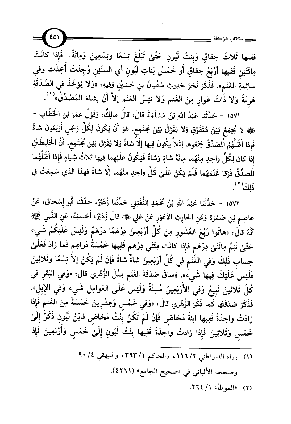 1571 - حَدَّثَنا عَبْدُ اللهِ بْنُ مَسْلَمَةَ قَالَ: قَالَ مَالِكٌ: وَقَوْلُ عُمَرَ بْنِ الخَطّابِ - رضي الله عنه - لا يُجْمَعُ بَيْنَ مُتَفَرِّقٍ وَلا يُفَرَّقُ بَيْنَ مُجْتَمِعٍ. هُوَ أَنْ يَكُونَ لِكُلِّ رَجُلٍ أَرْبَعُونَ شاةً فَإِذا أَظَلَّهُمُ المُصَدِّقُ جَمَعُوها لِئَلَّا يَكُونَ فِيها إلَّا شاةٌ وَلا يُفَرَّقُ بَيْنَ مُجْتَمِعٍ. أَنَّ الخَلِيطَيْنِ إِذا كانَ لِكُلِّ واحِدٍ مِنْهُما مِائَةُ شاةٍ وَشاةٌ فَيَكُونُ عَلَيْهِما فِيها ثَلاثُ شِياهٍ فَإِذَا أَظَلَّهُما المُصَدِّقُ فَرَّقا غَنَمَهُما فَلَمْ يَكُنْ عَلَى كُلِّ واحِدٍ مِنْهُما إلَّا شاةٌ فهذا الذي سَمِعْتُ في ذَلِكَ (¬2).