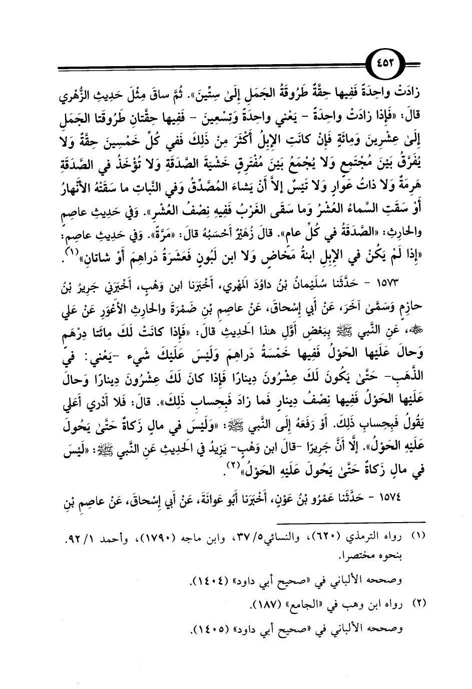 1573 - حَدَّثَنا سُلَيْمانُ بْنُ دَاوُدَ المَهْري، أَخْبَرَنا ابن وَهْبٍ، أَخْبَرَني جَرِيرُ بْنُ حازِمٍ وَسَمَّى آخَرَ، عَنْ أَبي إِسْحاقَ، عَنْ عاصِمِ بْنِ ضَمْرَةَ والحارِثِ الأَعْوَرِ عَنْ عَلي - رضي الله عنه -، عَنِ النَّبي - صلى الله عليه وسلم - بِبَعْضِ أَوَّلِ هذا الحَدِيثِ قَالَ: "فَإِذَا كَانَتْ لَكَ مِائَتا دِرْهَمٍ وَحالَ عَلَيْها الحَوْلُ فَفِيها خَمْسَةُ دَراهِمَ وَلَيْسَ عَلَيْكَ شَيء - يَعْني: في الذَّهَبِ - حَتَّى يَكُونَ لَكَ عِشْرُونَ دِينارًا فَإِذَا كَانَ لَكَ عِشْرُونَ دِينارًا وَحالَ عَلَيْها الحَوْلُ فَفِيها نِصْفُ دِينارٍ فَما زادَ فَبِحِسابِ ذَلِكَ". قَالَ: فَلا أَدْري أَعَلي يَقُولُ فَبِحِسابِ ذَلِكَ. أَوْ رَفَعَهُ إِلَى النَّبي - صلى الله عليه وسلم -: "وَلَيْسَ في مالٍ زَكاةٌ حَتَّى يَحُولَ عَلَيْهِ الحَوْلُ". إلَّا أَنَّ جَرِيرًا - قَالَ ابن وَهْبٍ - يَزِيدُ في الحَدِيثِ عَنِ النَّبي - صلى الله عليه وسلم -: "لَيْسَ في مالٍ زَكاةٌ حَتَّى يَحُولَ عَلَيْهِ الحَوْلُ" (¬2).