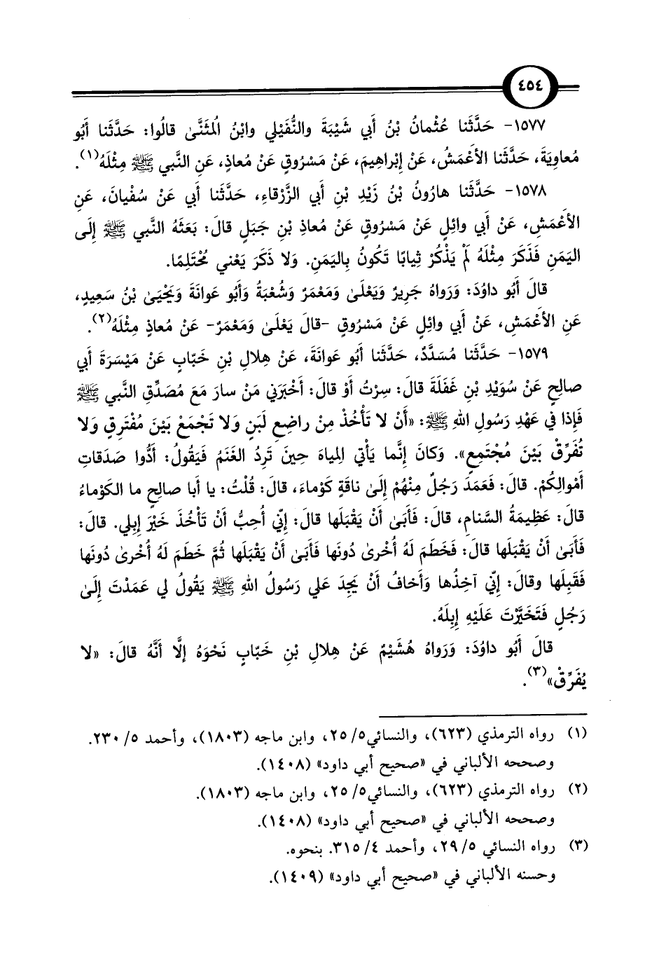1577 - حَدَّثَنا عُثْمانُ بْنُ أَبي شَيْبَةَ والنُّفَيْلي وابْنُ المُثَنَّى قَالُوا: حَدَّثَنا أَبُو مُعاوِيَةَ، حَدَّثَنا الأَعْمَشُ، عَنْ إِبْراهِيمَ، عَنْ مَسْرُوقٍ عَنْ مُعاذٍ، عَنِ النَّبي - صلى الله عليه وسلم - مِثْلَهُ (¬1).