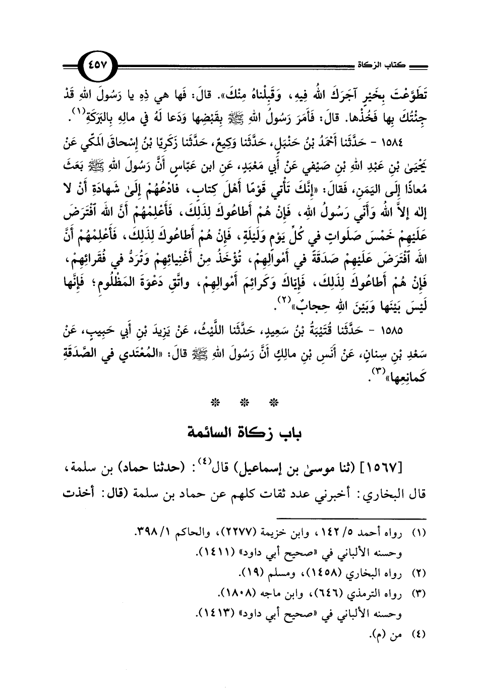 1585 - حَدَّثَنا قُتَيْبَةُ بْنُ سَعِيدٍ، حَدَّثَنا اللَّيْثُ، عَنْ يَزِيدَ بْنِ أَبي حَبِيبٍ، عَنْ سَعْدِ بْنِ سِنانٍ، عَنْ أَنَسِ بْنِ مالِكٍ أَنَّ رَسُولَ اللهِ - صلى الله عليه وسلم - قَالَ: "المُعْتَدي في الصَّدَقَةِ كَمانِعِها" (¬3).