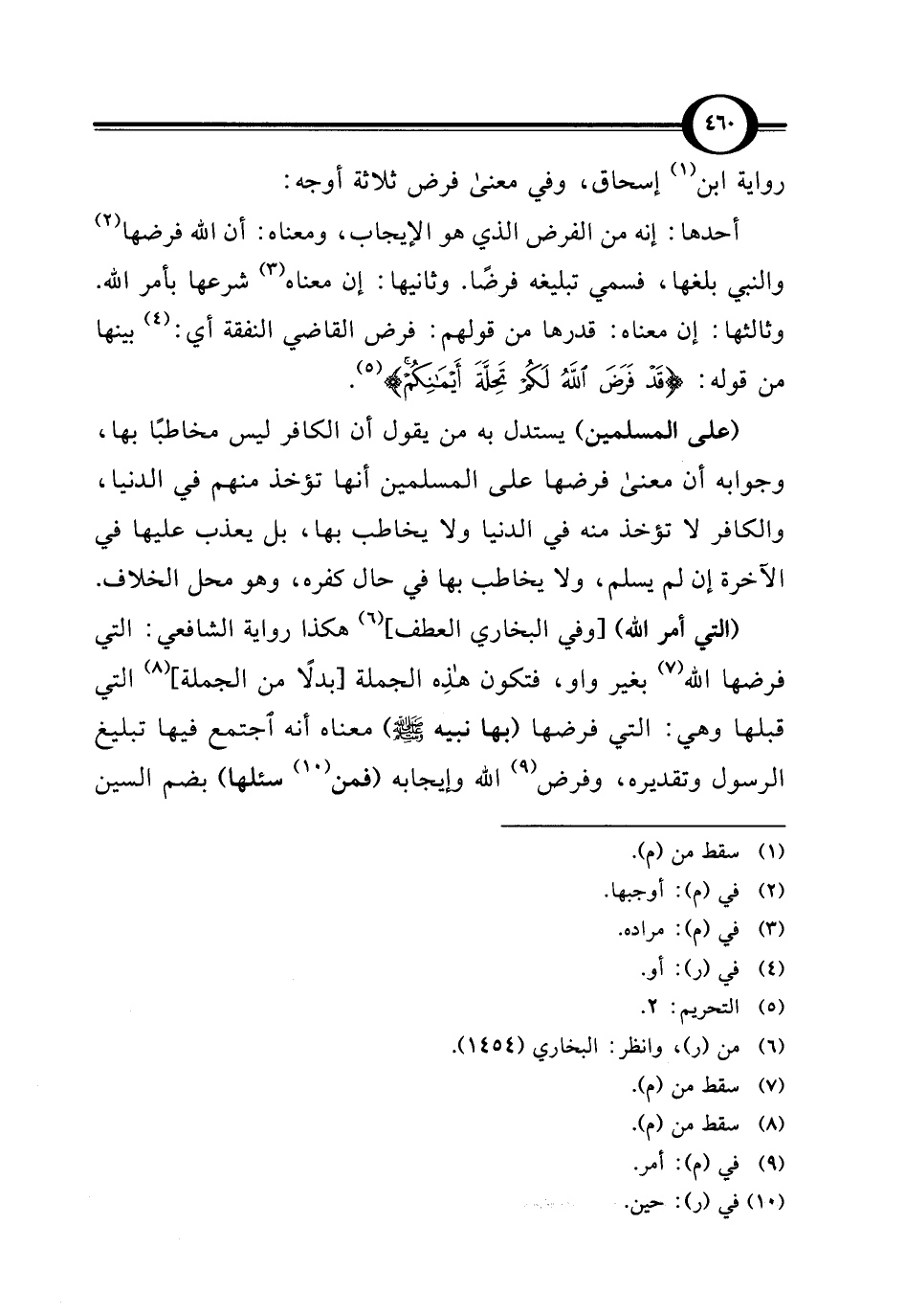 رواية ابن (¬1) إسحاق، وفي معنى فرض ثلاثة أوجه: