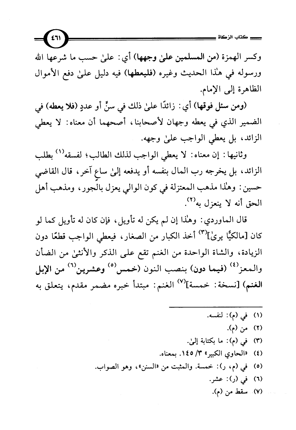 قال الماوردي: وهذا إن لم يكن له تأويل، فإن كان له تأويل كما لو كان [مالكيًّا يرى] (¬3) أخذ الكبار من الصغار، فيعطي الواجب قطعًا دون الزيادة، والشاة الواحدة من الغنم تقع على الذكر والأنثى من الضأن والمعز (¬4) (فيما دون) بنصب النون (خمس (¬5) وعشرين (¬6) من الإبل الغنم) [نسخة: خمسة] (¬7) الغنم: مبتدأ خبره مضمر مقدم، يتعلق به
