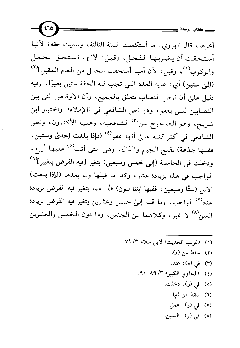 آخرها، قال الهروي: ما استكملت السنة الثالثة، وسميت حقة؛ لأنها استحقت أن يضربها الفحل، وقيل: لأنها تستحق الحمل والركوب (¬1)، وقيل: لأن أمها استحقت الحمل من العام المقبل] (¬2) (إلى ستين) أي: غاية العدد التي تجب فيه الحقة ستين بعيرًا، وفيه دليل على أن فرض النصاب يتعلق بالجميع، وأن الأوقاص التي بين النصابين ليس بعفو، وهو نص الشافعي في "الإملاء". واختيار ابن شريح، وهو الصحيح عن (¬3) الشافعية، وعليه الأكثرون، ونص الشافعي في أكثر كتبه على أنها عفو (¬4) (فإذا بلغت إحدى وستين، ففيها جذعة) بفتح الجيم والذال، وهي التي أتت (¬5) عليها أربع، ودخلت في الخامسة (إلى خمس وسبعين) يتغير [فيه الفرض بتغيير] (¬6) الواجب في هذا بزيادة عشر، وكذا ما قبلها وما بعدها (فإذا بلغت) الإبل (ستًّا وسبعين، ففيها ابنتا لبون) هذا مما يتغير فيه الفرض بزيادة عدد (¬7) الواجب، وما قبله إلى خمس وعشرين يتغير فيه الفرض بزيادة السن (¬8) لا غير، وكلاهما من الجنس، وما دون الخمس والعشرين