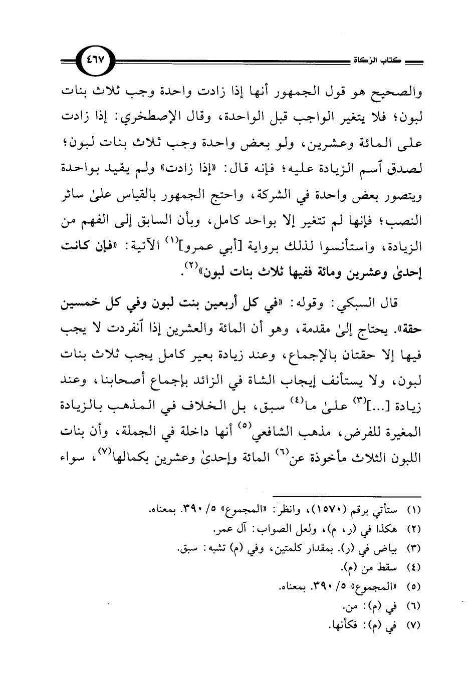 قال السبكي: وقوله: "في كل أربعين بنت لبون وفي كل خمسين حقة". يحتاج إلى مقدمة، وهو أن المائة والعشرين إذا انفردت لا يجب فيها إلا حقتان بالإجماع، وعند زيادة بعير كامل يجب ثلاث بنات لبون، ولا يستأنف إيجاب الشاة في الزائد بإجماع أصحابنا، وعند زيادة [. . .] (¬3) على ما (¬4) سبق، بل الخلاف في المذهب بالزيادة المغيرة للفرض، مذهب الشافعي (¬5) أنها داخلة في الجملة، وأن بنات اللبون الثلاث مأخوذة عن (¬6) المائة وإحدى وعشرين بكمالها (¬7)، سواء