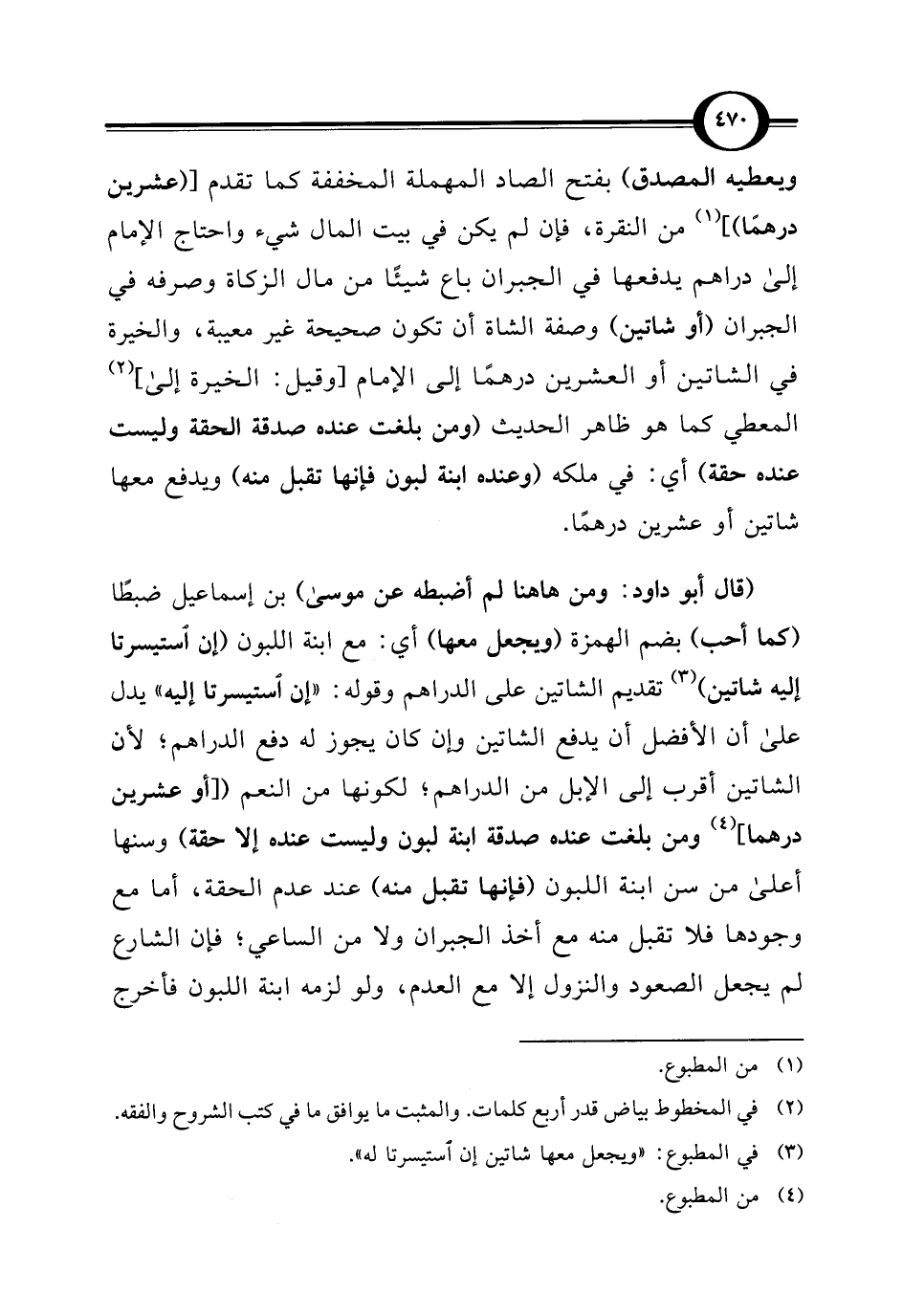 (قال أبو داود: ومن ها هنا لم أضبطه عن موسى) بن إسماعيل ضبطًا (كما أحب) بضم الهمزة (ويجعل معها) أي: مع ابنة اللبون (إن استيسرتا إليه شاتين) (¬3) تقديم الشاتين على الدراهم وقوله: "إن استيسرتا إليه" يدل على أن الأفضل أن يدفع الشاتين وإن كان يجوز له دفع الدراهم؛ لأن الشاتين أقرب إلى الإبل من الدراهم؛ لكونها من النعم ([أو عشرين درهما] (¬4) ومن بلغت عنده صدقة ابنة لبون وليست عنده إلا حقة) وسنها أعلى من سن ابنة اللبون (فإنها تقبل منه) عند عدم الحقة، أما مع وجودها فلا تقبل منه مع أخذ الجبران ولا من الساعي؛ فإن الشارع لم يجعل الصعود والنزول إلا مع العدم، ولو لزمه ابنة اللبون فأخرج