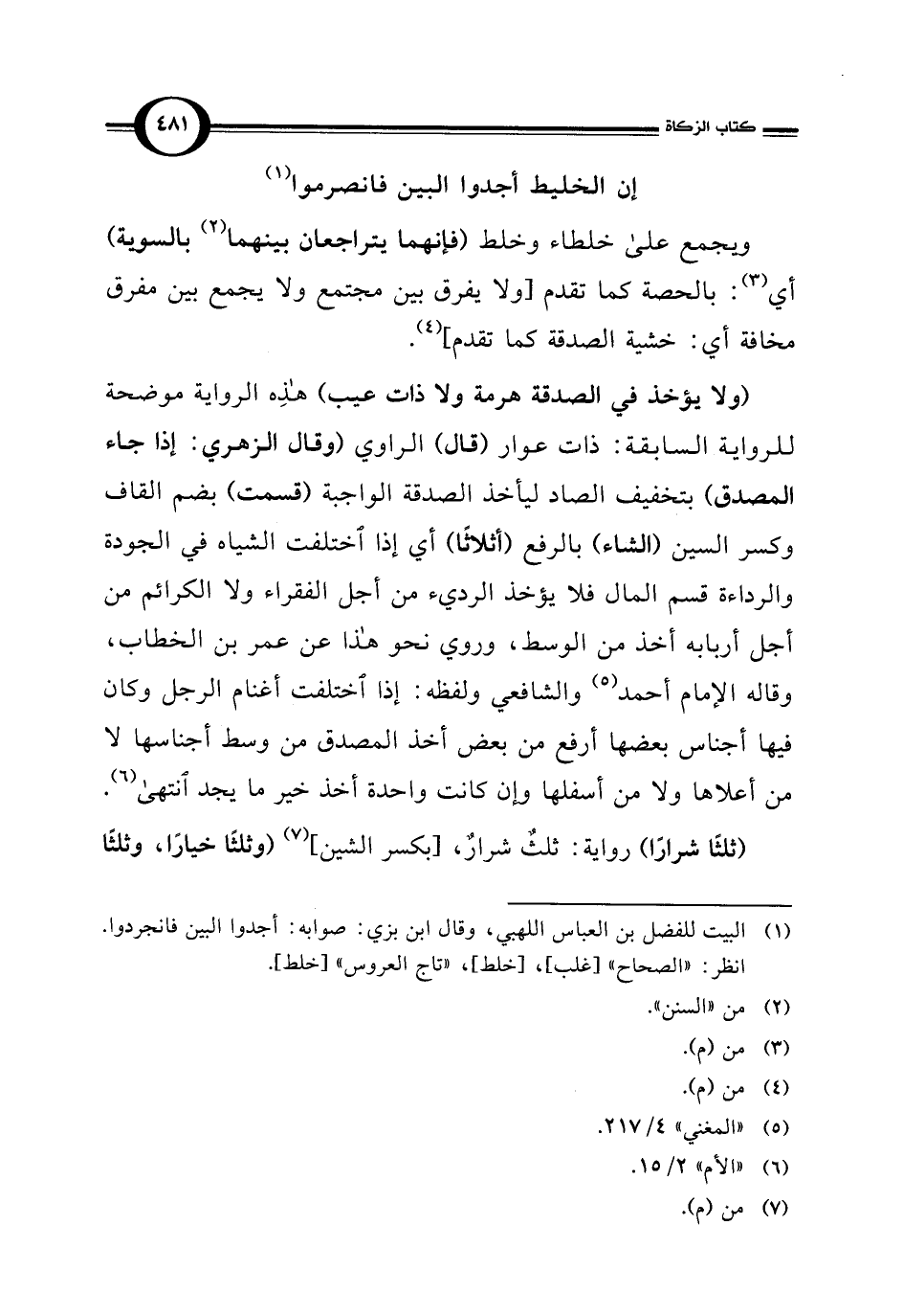 ويجمع على خلطاء وخلط (فإنهما يتراجعان بينهما (¬2) بالسوية) أي (¬3): بالحصة كما تقدم [ولا يفرق بين مجتمع ولا يجمع بين مفرق مخافة أي: خشية الصدقة كما تقدم] (¬4).