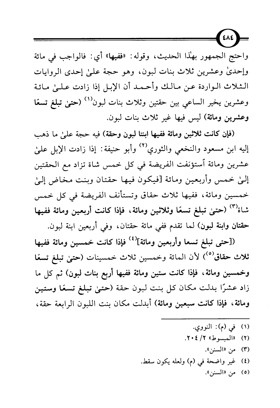 (فإن كانت ثلاثين ومائة ففيها ابنتا لبون وحقة) فيه حجة على ما ذهب إليه ابن مسعود والنخعي والثوري (¬2) وأبو حنيفة: إذا زادت الإبل على عشرين ومائة استؤنفت الفريضة في كل خمس شاة تزاد مع الحقتين إلى خمس وأربعين ومائة [فيكون فيها حقتان وبنت مخاض إلى خمسين ومائة، ففيها ثلاث حقاق وتستأنف الفريضة في كل خمس شاة (¬3) (حتى تبلغ تسعًا وثلاثين ومائة، فإذا كانت أربعين ومائة ففيها حقتان وابنة لبون) لما تقدم ففي مائة حقتان، وفي أربعين ابنة لبون.