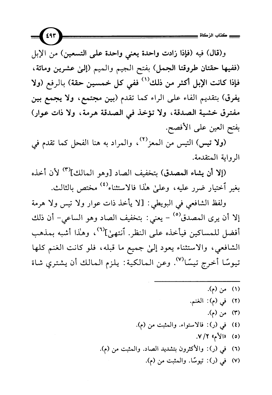 ولفظ الشافعي في البويطي: [لا يأخذ ذات عوار ولا تيس ولا هرمة إلا أن يرى المصدق (¬5) - يعني: بتخفيف الصاد وهو الساعي - أن ذلك أفضل للمساكين فيأخذه على النظر. انتهى] (¬6)، وهذا أشبه بمذهب الشافعي، والاستثناء يعود إلى جميع ما قبله، فلو كانت الغنم كلها تيوسًا أخرج تيسًا (¬7). وعن المالكية: يلزم المالك أن يشتري شاة