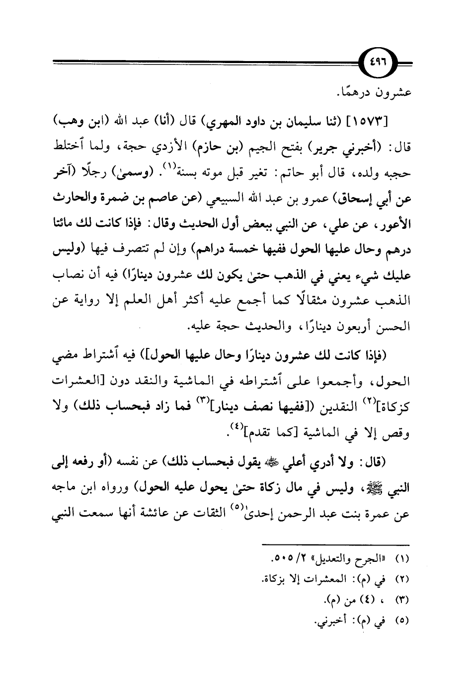 [1573] (ثنا سليمان بن داود المهري) قال (أنا) عبد الله (ابن وهب) قال: (أخبرني جرير) بفتح الجيم (بن حازم) الأزدي حجة، ولما اختلط حجبه ولده، قال أبو حاتم: تغير قبل موته بسنة (¬1). (وسمى) رجلًا (آخر عن أبي إسحاق) عمرو بن عبد الله السبيعي (عن عاصم بن ضمرة والحارث الأعور، عن علي، عن النبي ببعض أول الحديث وقال: فإذا كانت لك مائتا درهم وحال عليها الحول ففيها خمسة دراهم) وإن لم تتصرف فيها (وليس عليك شيء يعني في الذهب حتى يكون لك عشرون دينارًا) فيه أن نصاب الذهب عشرون مثقالًا كما أجمع عليه أكثر أهل العلم إلا رواية عن الحسن أربعون دينارًا، والحديث حجة عليه.