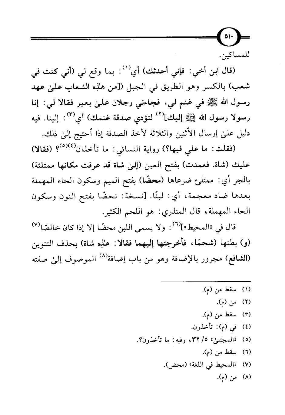 (فقلت: ما علي فيها؟ ) رواية النسائي: ما تأخذان (¬4) (¬5)؟ (فقالا) عليك (شاة. فعمدت) بفتح العين (إلى شاة قد عرفت مكانها ممتلئة) بالجر أي: ممتلئ ضرعاها (محضًا) بفتح الميم وسكون الحاء المهملة بعدها ضاد معجمة، أي: لبنًا. [نسخة: نحضًا بفتح النون وسكون الحاء المهملة، قال المنذري: هو اللحم الكثير.