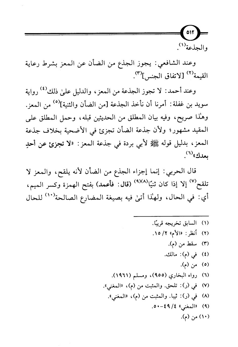 وعند أحمد: لا تجوز الجذعة من المعز، والدليل على ذلك (¬4) رواية سويد بن غفلة: أمرنا أن نأخذ الجذعة [من الضأن والثنية] (¬5) من المعز. وهذا صريح، وفيه بيان المطلق من الحديثين قبله، وحمل المطلق على المقيد مشهور؛ ولأن جذعة الضأن تجزئ في الأضحية بخلاف جذعة المعز، بدليل قوله - صلى الله عليه وسلم - لأبي بردة في جذعة المعز: "لا تجزئ عن أحدٍ بعدك" (¬6).