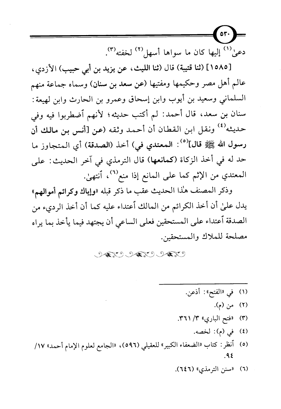 [1585] (ثنا قتيبة) قال (ثنا الليث، عن يزيد بن أبي حبيب) الأزدي، عالم أهل مصر وحكيمها ومفتيها (عن سعد بن سنان) وسماه جماعة منهم السلماني وسعيد بن أيوب وابن إسحاق وعمرو بن الحارث وابن لهيعة: سنان بن سعد، قال أحمد: لم أكتب حديثه؛ لأنهم اضطربوا فيه وفي حديثه (¬4) ونقل ابن القطان أن أحمد وثقه (عن [أنس بن مالك أن رسول الله - صلى الله عليه وسلم - قال] (¬5): المعتدي في) أخذ (الصدقة) أي المتجاوز ما حد له في أخذ الزكاة (كمانعها) قال الترمذي في آخر الحديث: على المعتدي من الإثم كما على المانع إذا منع (¬6)، انتهى.