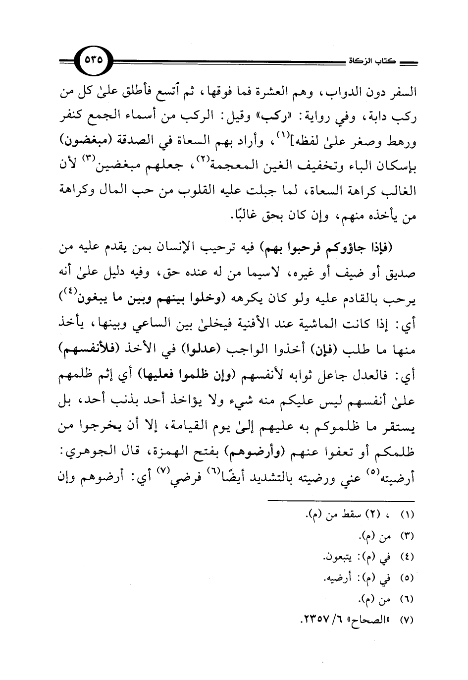 (فإذا جاؤوكم فرحبوا بهم) فيه ترحيب الإنسان بمن يقدم عليه من صديق أو ضيف أو غيره، لا سيما من له عنده حق، وفيه دليل على أنه يرحب بالقادم عليه ولو كان يكرهه (وخلوا بينهم وبين ما يبغون) (¬4) أي: إذا كانت الماشية عند الأفنية فيخلى بين الساعي وبينها، يأخذ منها ما طلب (فإن) أخذوا الواجب (عدلوا) في الأخذ (فلأنفسهم) أي: فالعدل جاعل ثوابه لأنفسهم (وإن ظلموا فعليها) أي إثم ظلمهم على أنفسهم ليس عليكم منه شيء ولا يؤاخذ أحد بذنب أحد، بل يستقر ما ظلموكم به عليهم إلى يوم القيامة، إلا أن يخرجوا من ظلمكم أو تعفوا عنهم (وأرضوهم) بفتح الهمزة، قال الجوهري: أرضيته (¬5) عني ورضيته بالتشديد أيضًا (¬6) فرضي (¬7) أي: أرضوهم وإن