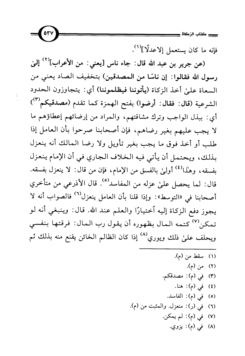 (عن جرير بن عبد الله قال: جاء ناس [يعني: من الأعراب] (¬2) إلى رسول الله فقالوا: إن ناسًا من المصدقين) بتخفيف الصاد يعني من السعاة على أخذ الزكاة (يأتوننا فيظلموننا) أي: يتجاوزون الحدود الشرعية (قال: فقال: أرضوا) بفتح الهمزة كما تقدم (مصدقيكم) (¬3) أي: ببذل الواجب وترك مشاقتهم، والمراد من إرضائهم إعطاؤهم ما لا يجب عليهم بغير رضاهم، فإن أصحابنا صرحوا بأن العامل إذا طلب أو أخذ فوق ما يجب بغير تأويل ولا رضا المالك أنه ينعزل بذلك، ويحتمل أن يأتي فيه الخلاف الجاري في أن الإمام ينعزل بفسقه، وهذا (¬4) أولى بالفسق من الإمام، فإن من قال: لا ينعزل بفسقه. قال: لما يحصل على عزله من المفاسد (¬5). قال الأذرعي من متأخري أصحابنا في "التوسط": وإذا قلنا بأن العامل ينعزل (¬6) فالصواب أنه لا يجوز دفع الزكاة إليه اختيارًا والعلم عند الله. قال: وينبغي أنه لو تمكن (¬7) كتمه المال بظهوره أن يقول رب المال: فرقتها بنفسي ويحلف على ذلك ويوري (¬8) إذا كان الظالم الخائن يقنع منه بذلك ثم