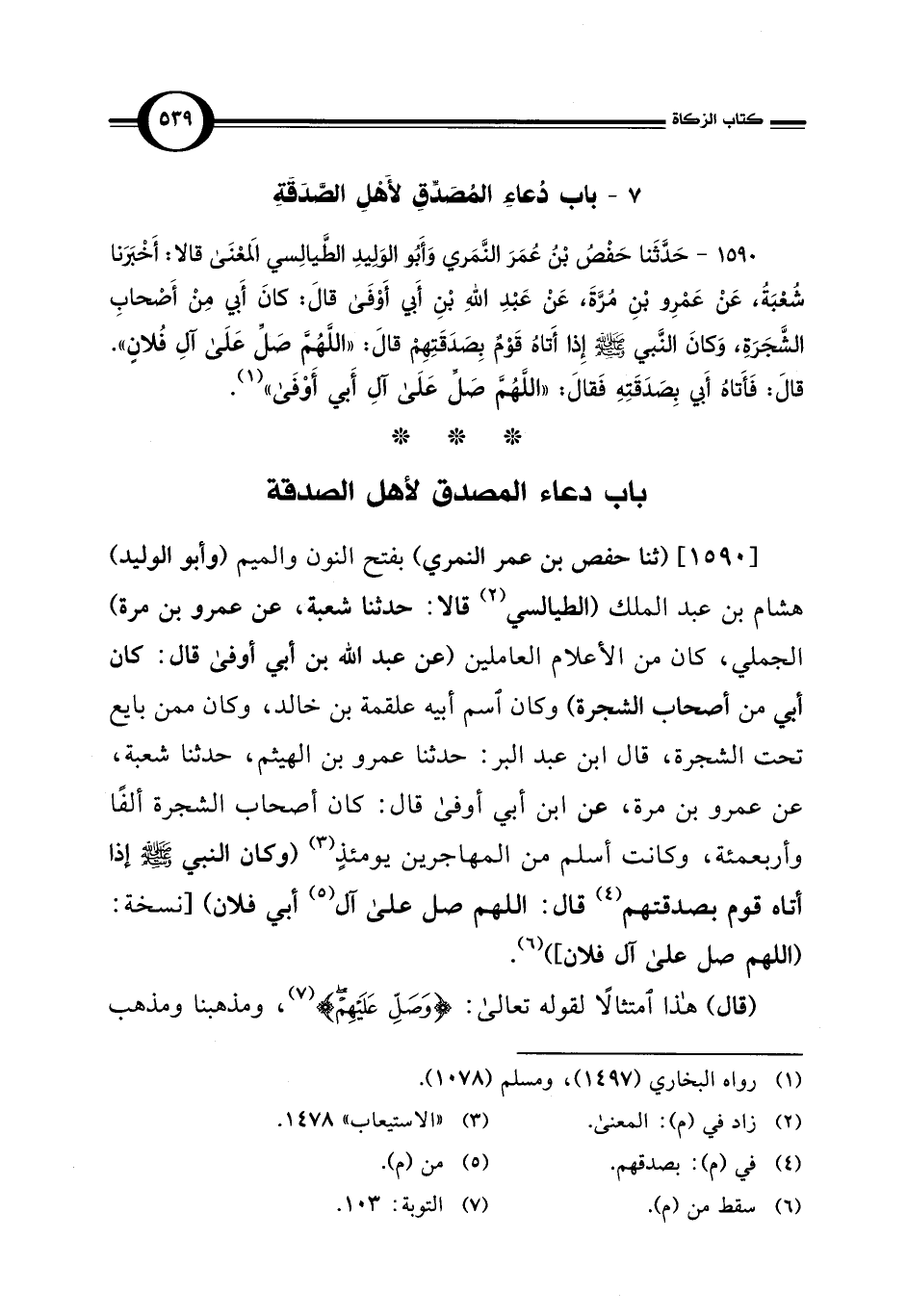 [1590] (ثنا حفص بن عمر النمري) بفتح النون والميم (وأبو الوليد) هشام بن عبد الملك (الطيالسي (¬2) قالا: حدثنا شعبة، عن عمرو بن مرة) الجملي، كان من الأعلام العاملين (عن عبد الله بن أبي أوفى قال: كان أبي من أصحاب الشجرة) وكان اسم أبيه علقمة بن خالد، وكان ممن بايع تحت الشجرة، قال ابن عبد البر: حدثنا عمرو بن الهيثم، حدثنا شعبة، عن عمرو بن مرة، عن ابن أبي أوفى قال: كان أصحاب الشجرة ألفًا وأربعمئة، وكانت أسلم من المهاجرين يومئذٍ (¬3) (وكان النبي - صلى الله عليه وسلم - إذا أتاه قوم بصدقتهم (¬4) قال: اللهم صل على آل (¬5) أبي فلان) [نسخة: (اللهم صل على آل فلان]) (¬6).