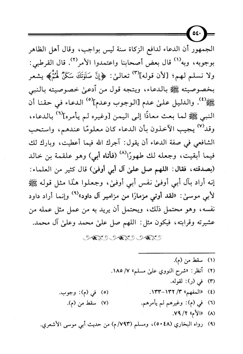 الجمهور أن الدعاء لدافع الزكاة سنة ليس بواجب، وقال أهل الظاهر بوجوبه، وبه (¬1) قال بعض أصحابنا واعتمدوا الأمر (¬2). قال القرطبي: ولا نسلم لهم؛ [لأن قوله] (¬3) تعالى: {إِنَّ صَلَاتَكَ سَكَنٌ لَهُمْ} يشعر بخصوصيته - صلى الله عليه وسلم - بالدعاء، ويتجه قول من ادعى خصوصيته بالنبي - صلى الله عليه وسلم - (¬4). والدليل على عدم [الوجوب وعدم] (¬5) الدعاء في حقنا أن النبي - صلى الله عليه وسلم - لما بعث معاذًا إلى اليمن [وغيره لم يأمره] (¬6) بالدعاء، وقد (¬7) يجيب الآخذون بأن الدعاء كان معلومًا عندهم، واستحب الشافعي في صفة الدعاء أن يقول: آجرك الله فيما أعطيت، وبارك لك فيما أبقيت، وجعله لك طهورًا (¬8) (فأتاه أبي) وهو علقمة بن خالد (بصدقته، فقال: اللهم صل على آل أبي أوفى) قال كثير من العلماء: إنه أراد بآل أبي أوفى نفس أبي أوفى، وجعلوا هذا مثل قوله - صلى الله عليه وسلم - لأبي موسى: "لقد أوتي مزمازًا من مزامير آل داود" (¬9) وإنما أراد داود نفسه، وهو محتمل ذلك، ويحتمل أن يريد به من عمل مثل عمله من عشيرته وقرابته، فيكون مثل: اللهم صل على محمد وعلى آل محمد.