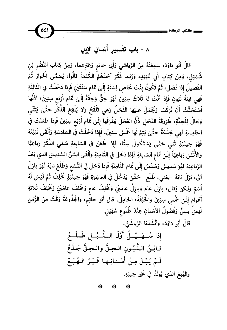 قَالَ أَبُو دَاوُدَ: سَمِعْتُهُ مِنَ الرِّياشي وَأَبي حاتِمٍ وَغَيْرِهِما، وَمِنْ كِتابِ النَّضْرِ بْنِ شُمَيْلٍ، وَمِنْ كِتابِ أَبي عُبَيْدٍ، وَرُبَّما ذَكَرَ أَحَدُهُمُ الكَلِمَةَ قَالُوا: يُسَمَّى الحُوارَ ثُمَّ الفَصِيلَ إِذَا فَصَلَ، ثُمَّ تَكُونُ بِنْتَ مَخاضٍ لِسَنَةٍ إِلَى تَمامِ سَنَتَيْنِ فَإِذَا دَخَلَتْ في الثّالِثَةِ فَهي ابنةُ لَبُونٍ فَإِذَا تَمَّتْ لَهُ ثَلاثُ سِنِينَ فَهُوَ حِقٌّ وَحِقَّةٌ إِلَى تَمامِ أَرْبَعِ سِنِينَ؛ لأنَّها اسْتَحَقَّتْ أَنْ تُرْكَبَ وَيُحْمَلَ عَلَيْها الفَحْلُ وَهي تَلْقَحُ وَلا يُلْقِحُ الذَّكَرُ حَتَّى يُثَنّي وَيُقالُ لِلْحِقَّةِ: طَرُوقَةُ الفَحْلِ لأَنَّ الفَحْلَ يَطْرُقُها إِلَى تَمامِ أَرْبَعِ سِنِينَ فَإذَا طَعَنَتْ في الخَامِسَةِ فَهي جَذَعَةٌ حَتَّى يَتِمَّ لَها خَمْسُ سِنِينَ، فَإِذَا دَخَلَتْ في السّادِسَةِ وَأَلْقَى ثَنِيَّتَهُ فَهُوَ حِينَئِذٍ ثَني حَتَّى يَسْتَكْمِلَ سِتًّا، فَإِذَا طَعَنَ في السّابِعَةِ سُمّي الذَّكَرُ رَباعِيًّا والأُنْثَى رَباعِيَّةً إِلَى تَمامِ السّابِعَةِ فَإِذَا دَخَلَ في الثّامِنَةِ وَأَلْقَى السِّنَّ السَّدِيسَ الذي بَعْدَ الرَّباعِيَةِ فَهُوَ سَدِيسٌ وَسَدَسٌ إِلَى تَمامِ الثّامِنَةِ فَإِذَا دَخَلَ في التِّسْعِ وَطَلَعَ نابُهُ فَهُوَ بازِلٌ أي: بَزَلَ نابُهُ - يَعْني: طَلَعَ - حَتَّى يَدْخُلَ في العاشِرَةِ فَهُوَ حِينَئِذٍ مُخْلِفٌ ثُمَّ لَيْسَ لَهُ اسْمٌ ولكن يُقالُ: بازِلُ عامِ وَبازِلُ عامَيْنِ وَمُخْلِفُ عامٍ وَمُخْلِفُ عامَيْنِ وَمُخلِفُ ثَلاثَةِ أَعْوامٍ إِلَى خَمسِ سِنِينَ والخَلِفَةُ: الحامِلُ. قَالَ أَبُو حاتِمٍ: والجَذوعَةُ وَقْتٌ مِنَ الزَّمَنِ لَيْسَ بِسِنٍّ وَفُصُولُ الأَسنانِ عِنْدَ طُلُوعِ سُهَيْلٍ.