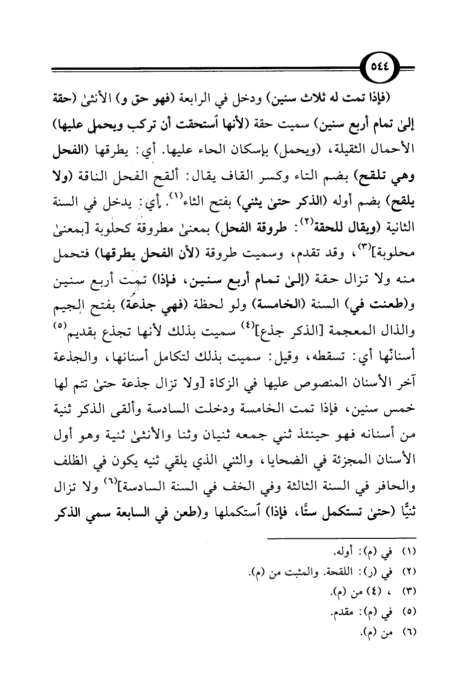 (فإذا تمت له ثلاث سنين) ودخل في الرابعة (فهو حق و) الأنثى (حقة إلى تمام أربع سنين) سميت حقة (لأنها استحقت أن تركب ويحمل عليها) الأحمال الثقيلة، (ويحمل) بإسكان الحاء عليها. أي: يطرقها (الفحل وهي تلقح) بضم التاء وكسر القاف يقال: ألقح الفحل الناقة (ولا يلقح) بضم أوله (الذكر حتى يثني) بفتح الثاء (¬1). أي: يدخل في السنة الثانية (ويقال للحقة (¬2): طروقة الفحل) بمعنى مطروقة كحلوبة [بمعنى محلوبة] (¬3)، وقد تقدم، وسميت طروقة (لأن الفحل يطرقها) فتحمل منه ولا تزال حقة (إلى تمام أربع سنين، فإذا) تمت أربع سنين و (طعنت في) السنة (الخامسة) ولو لحظة (فهي جذعة) بفتح الجيم والذال المعجمة [الذكر جذع] (¬4) سميت بذلك لأنها تجذع بقديم (¬5) أسنانها أي: تسقطه، وقيل: سميت بذلك لتكامل أسنانها، والجذعة آخر الأسنان المنصوص عليها في الزكاة [ولا تزال جذعة حتى تتم لها خمس سنين، فإذا تمت الخامسة ودخلت السادسة وألقى الذكر ثنية من أسنانه فهو حينئذ ثني جمعه ثنيان وثنا والأنثى ثنية وهو أول الأسنان المجزئة في الضحايا، والثني الذي يلقي ثنيه يكون في الظلف والحافر في السنة الثالثة وفي الخف في السنة السادسة] (¬6) ولا تزال ثنيًّا (حتى تستكمل ستًّا، فإذا) استكملها و (طعن في السابعة سمي الذكر
