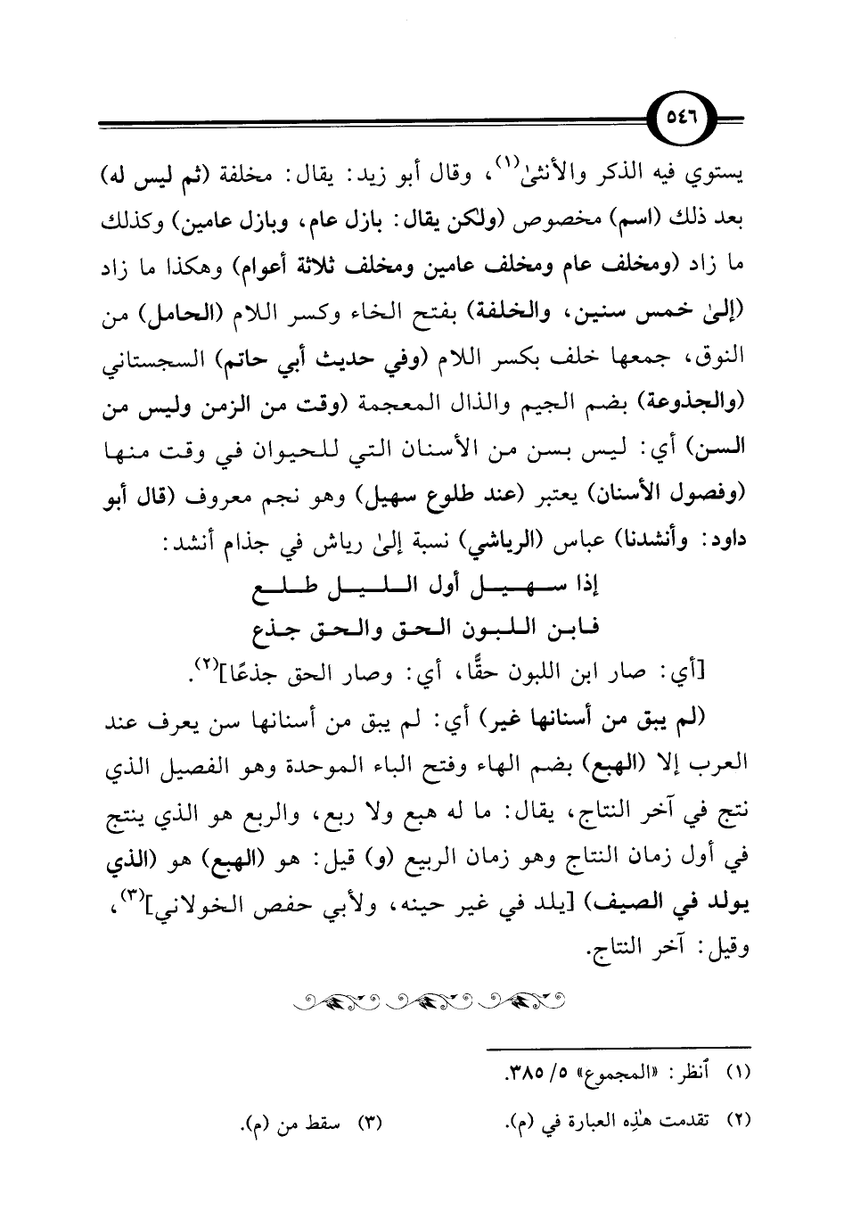 يستوي فيه الذكر والأنثى (¬1)، وقال أبو زيد: يقال: مخلفة (ثم ليس له) بعد ذلك (اسم) مخصوص (ولكن يقال: بازل عام، وبازل عامين) وكذلك ما زاد (ومخلف عام ومخلف عامين ومخلف ثلاثة أعوام) وهكذا ما زاد (إلى خمس سنين، والخلفة) بفتح الخاء وكسر اللام (الحامل) من النوق، جمعها خلف بكسر اللام (وفي حديث أبي حاتم) السجستاني (والجذوعة) بضم الجيم والذال المعجمة (وقت من الزمن وليس من السن) أي: ليس بسن من الأسنان التي للحيوان في وقت منها (وفصول الأسنان) يعتبر (عند طلوع سهيل) وهو نجم معروف (قال أبو داود: وأنشدنا) عباس (الرياشي) نسبة إلى رياش في جذام أنشد: