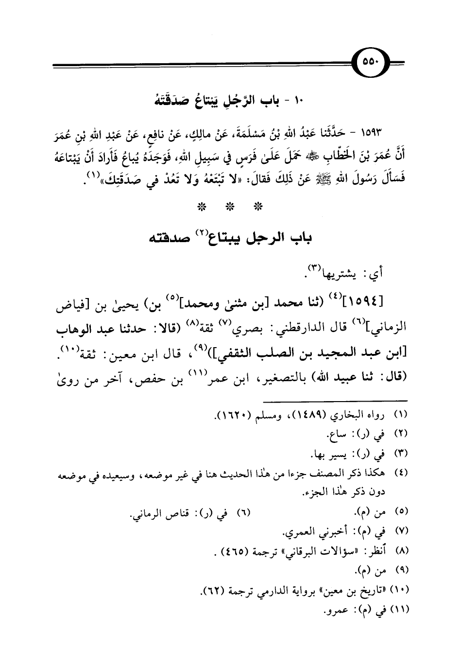 1593 - حَدَّثَنا عَبْدُ اللهِ بْنُ مَسْلَمَةَ، عَنْ مالِكٍ، عَنْ نافِعٍ، عَنْ عَبْدِ اللهِ بْنِ عُمَرَ أَنَّ عُمَرَ بْنَ الخَطّابِ - رضي الله عنه - حَمَلَ عَلَى فَرَسٍ في سَبِيلِ اللهِ، فَوَجَدَهُ يُباعُ فَأَرادَ أَنْ يَبْتاعَهُ فَسَأَلَ رَسُولَ اللهِ - صلى الله عليه وسلم - عَنْ ذَلِكَ فَقَالَ: "لا تَبْتَعْهُ وَلا تَعُدْ في صَدَقَتِكَ" (¬1).