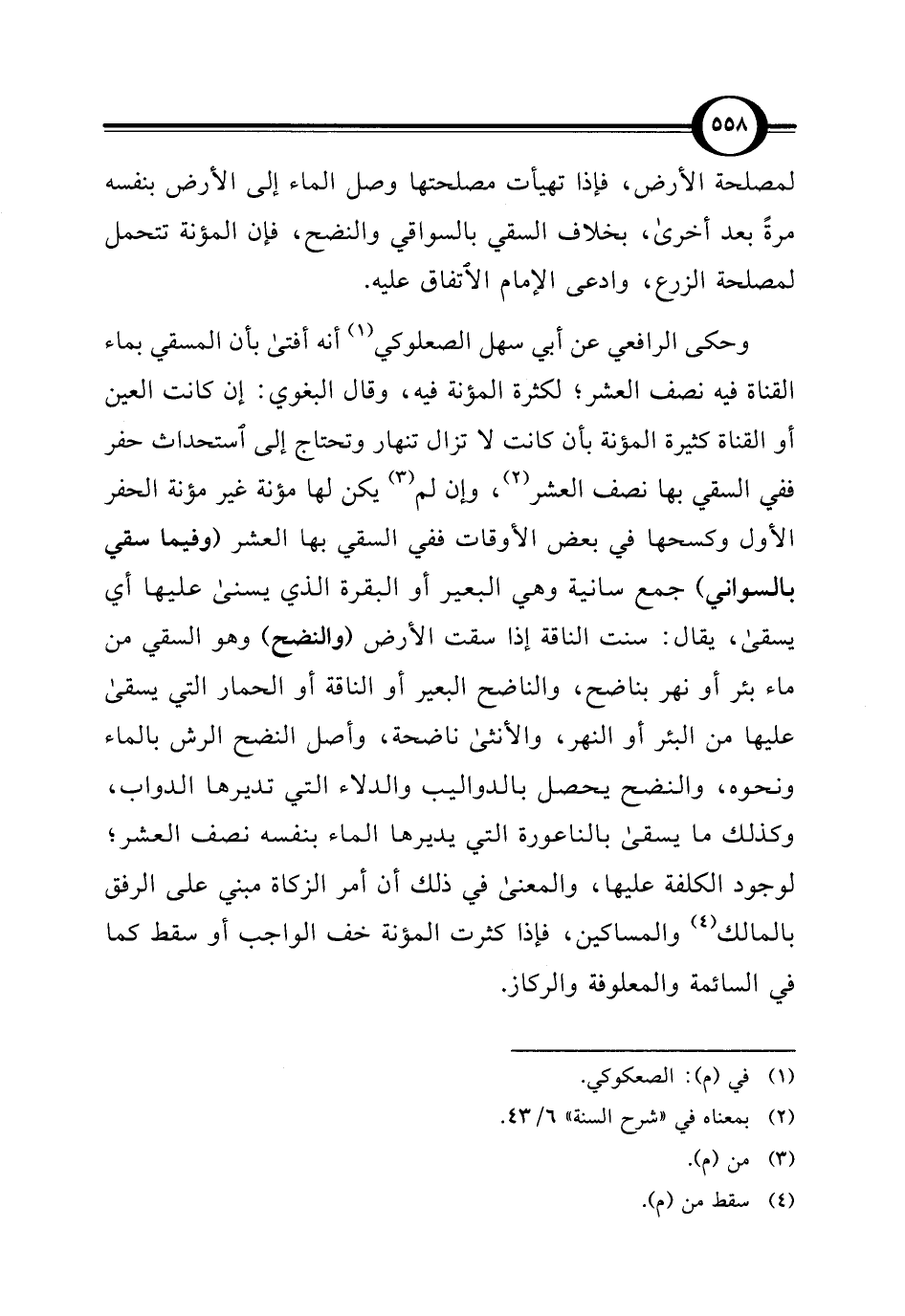 وحكى الرافعي عن أبي سهل الصعلوكي (¬1) أنه أفتى بأن المسقي بماء القناة فيه نصف العشر؛ لكثرة المؤنة فيه، وقال البغوي: إن كانت العين أو القناة كثيرة المؤنة بأن كانت لا تزال تنهار وتحتاج إلى استحداث حفر ففي السقي بها نصف العشر (¬2)، وإن لم (¬3) يكن لها مؤنة غير مؤنة الحفر الأول وكسحها في بعض الأوقات ففي السقي بها العشر (وفيما سقي بالسواني) جمع سانية وهي البعير أو البقرة الذي يسنى عليها أي يسقى، يقال: سنت الناقة إذا سقت الأرض (والنضح) وهو السقي من ماء بئر أو نهر بناضح، والناضح البعير أو الناقة أو الحمار التي يسقى عليها من البئر أو النهر، والأنثى ناضحة، وأصل النضح الرش بالماء ونحوه، والنضح يحصل بالدواليب والدلاء التي تديرها الدواب، وكذلك ما يسقى بالناعورة التي يديرها الماء بنفسه نصف العشر؛ لوجود الكلفة عليها، والمعنى في ذلك أن أمر الزكاة مبني على الرفق بالمالك (¬4) والمساكين، فإذا كثرت المؤنة خف الواجب أو سقط كما في السائمة والمعلوفة والركاز.