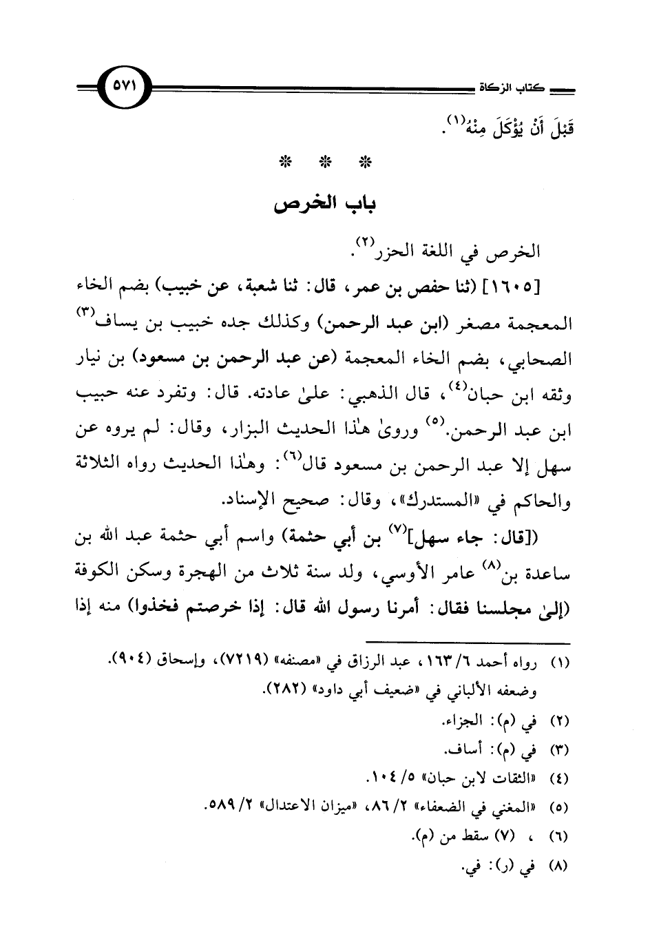 [1605] (ثنا حفص بن عمر، قال: ثنا شعبة، عن خبيب) بضم الخاء المعجمة مصغر (ابن عبد الرحمن) وكذلك جده خبيب بن يساف (¬3) الصحابي، بضم الخاء المعجمة (عن عبد الرحمن بن مسعود) بن نيار وثقه ابن حبان (¬4)، قال الذهبي: على عادته. قال: وتفرد عنه حبيب بن عبد الرحمن. (¬5) وروى هذا الحديث البزار، وقال: لم يروه عن سهل إلا عبد الرحمن بن مسعود قال (¬6): وهذا الحديث رواه الثلاثة والحاكم في "المستدرك"، وقال: صحيح الإسناد.