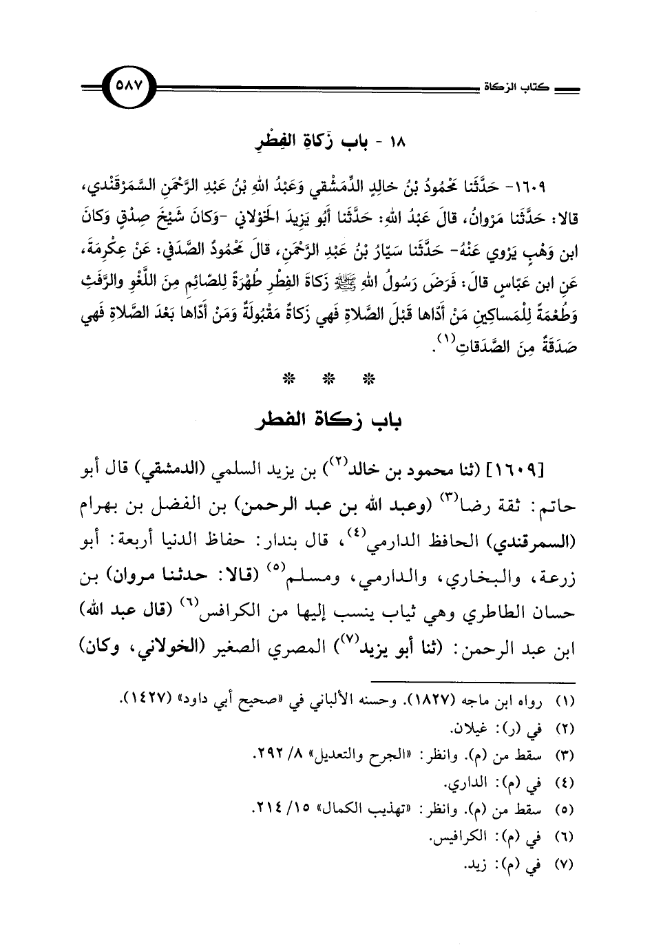 [1609] (ثنا محمود بن خالد) (¬2) بن يزيد السلمي (الدمشقي) قال أبو حاتم: ثقة رضا (¬3) (وعبد الله بن عبد الرحمن) بن الفضل بن بهرام (السمرقندي) الحافظ الدارمي (¬4)، قال بندار: حفاظ الدنيا أربعة: أبو زرعة، والبخاري، والدارمي، ومسلم (¬5) (قالا: حدثنا مروان) بن حسان الطاطري وهي ثياب ينسب إليها من الكرافس (¬6) (قال عبد الله) بن عبد الرحمن: (ثنا أبو يزيد) (¬7) المصري الصغير (الخولاني، وكان)