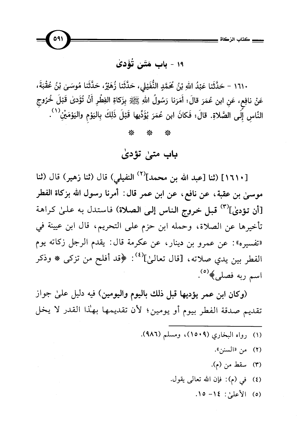 1610 - حَدَّثَنا عَبْدُ اللهِ بْن مُحَمَّدٍ النُّفَيْلي، حَدَّثَنا زُهَيْرٌ، حَدَّثَنا مُوسَى بْنُ عُقْبَةَ، عَنْ نافِعٍ، عَنِ ابن عُمَرَ قَالَ: أَمَرَنا رَسُولُ اللهِ - صلى الله عليه وسلم - بِزَكاةِ الفِطْرِ أَنْ تُؤَدى قَبْلَ خُرُوجِ النَّاسِ إِلَى الصَّلاةِ. قَالَ: فَكَانَ ابن عُمَرَ يُؤَدِّيها قَبْلَ ذَلِكَ بِاليَوْمِ واليَوْمَيْنِ (¬1).