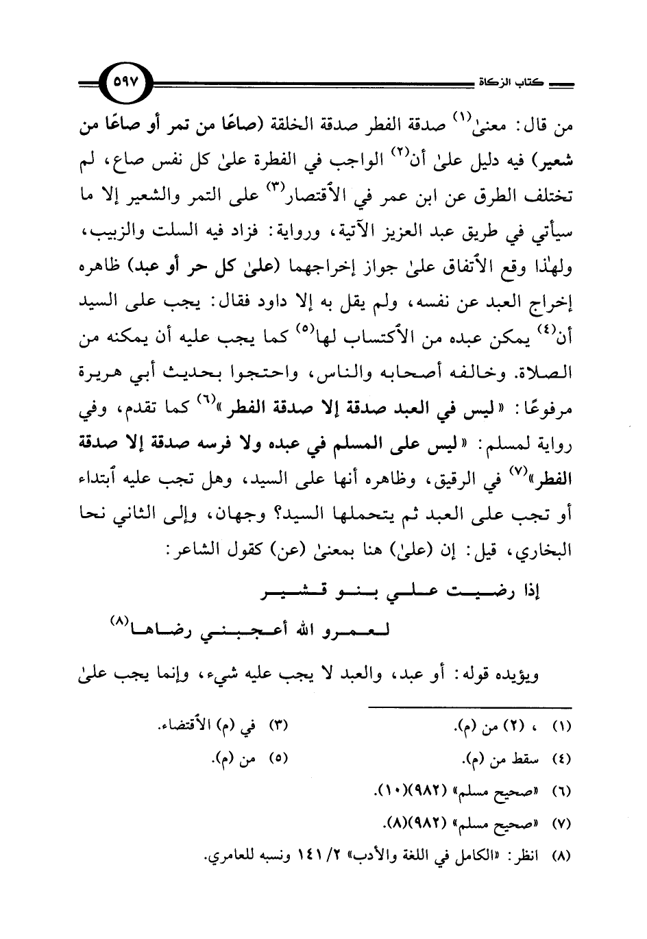 من قال: معنى (¬1) صدقة الفطر صدقة الخلقة (صاعًا من تمر أو صاعًا من شعير) فيه دليل على أن (¬2) الواجب في الفطرة على كل نفس صاع، لم تختلف الطرق عن ابن عمر في الاقتصار (¬3) على التمر والشعير إلا ما سيأتي في طريق عبد العزيز الآتية، ورواية: فزاد فيه السلت والزبيب، ولهذا وقع الاتفاق على جواز إخراجهما (على كل حر أو عبد) ظاهره إخراج العبد عن نفسه، ولم يقل به إلا داود فقال: يجب على السيد أن (¬4) يمكن عبده من الاكتساب لها (¬5) كما يجب عليه أن يمكنه من الصلاة. وخالفه أصحابه والناس، واحتجوا بحديث أبي هريرة مرفوعًا: "ليس في العبد صدقة إلا صدقة الفطر" (¬6) كما تقدم، وفي رواية لمسلم: "ليس على المسلم في عبده ولا فرسه صدقة إلا صدقة الفطر" (¬7) في الرقيق، وظاهره أنها على السيد، وهل تجب عليه ابتداء أو تجب على العبد ثم يتحملها السيد؟ وجهان، وإلى الثاني نحا البخاري، قيل: إن (على) هنا بمعنى (عن) كقول الشاعر: