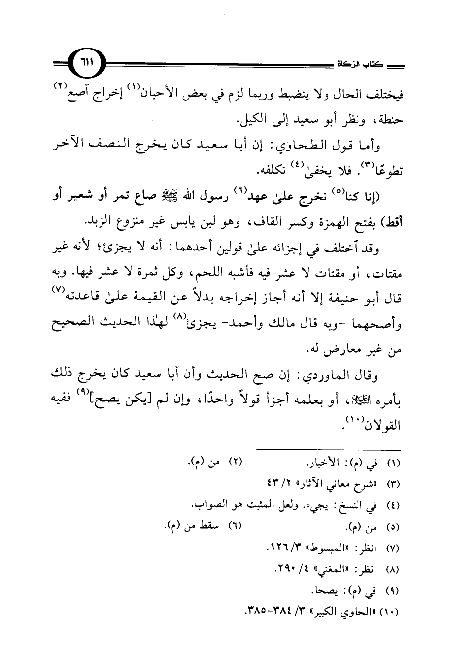 فيختلف الحال ولا ينضبط وربما لزم في بعض الأحيان (¬1) إخراج آصع (¬2) حنطة، ونظر أبو سعيد إلى الكيل.