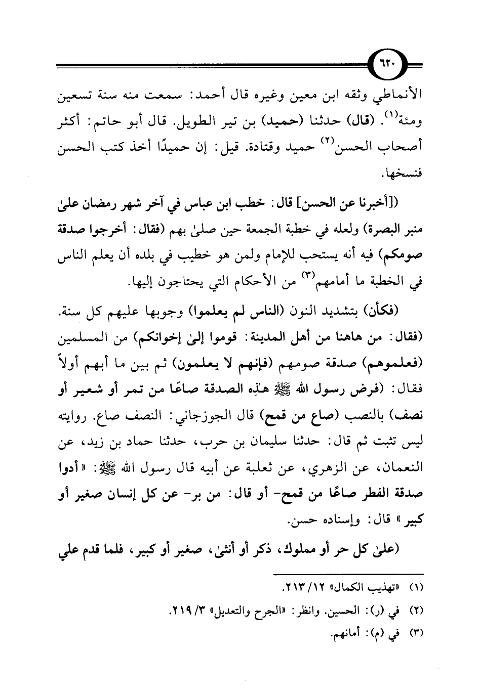 ([أخبرنا عن الحسن] قال: خطب ابن عباس في آخر شهر رمضان على منبر البصرة) ولعله في خطبة الجمعة حين صلى بهم (فقال: أخرجوا صدقة صومكم) فيه أنه يستحب للإمام ولمن هو خطيب في بلده أن يعلم الناس في الخطبة ما أمامهم (¬3) من الأحكام التي يحتاجون إليها.