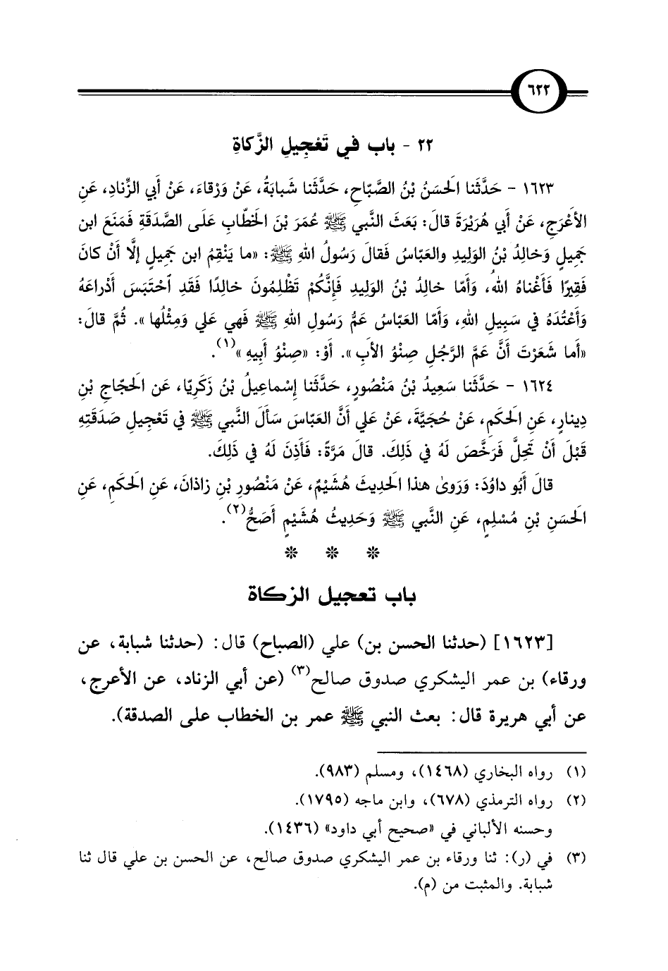 1623 - حَدَّثَنا الحَسَنُ بْنُ الصَّبّاحِ، حَدَّثَنا شَبابَةُ، عَنْ وَرْقاءَ، عَنْ أَبي الزِّنادِ، عَنِ الأَعْرَجِ، عَنْ أَبي هُرَيْرَةَ قَالَ: بَعَثَ النَّبي - صلى الله عليه وسلم - عُمَرَ بْنَ الخَطّابِ عَلَى الصَّدَقَةِ فَمَنَعَ ابن جَمِيلٍ وَخالِدُ بْنُ الوَلِيدِ والعَبّاسُ فَقَالَ رَسُولُ اللهِ - صلى الله عليه وسلم -: "ما يَنْقِمُ ابن جَمِيلٍ إلَّا أَنْ كَانَ فَقِيرًا فَأَغْناهُ اللهُ، وَأَمّا خالِدُ بْن الوَلِيدِ فَإِنَّكُمْ تَظْلِمُونَ خالِدًا فَقَدِ احْتَبَسَ أَدْراعَهُ وَأَعْتُدَهُ في سَبِيلِ اللهِ، وَأَمّا العَبّاسُ عَمُّ رَسُولِ اللهِ - صلى الله عليه وسلم - فَهي عَلي وَمِثْلُها". ثُمَّ قَالَ: "أَما شَعَرْتَ أَنَّ عَمَّ الرَّجُلِ صِنْوُ الأَبِ". أَوْ: "صِنْوُ أَبِيهِ" (¬1).