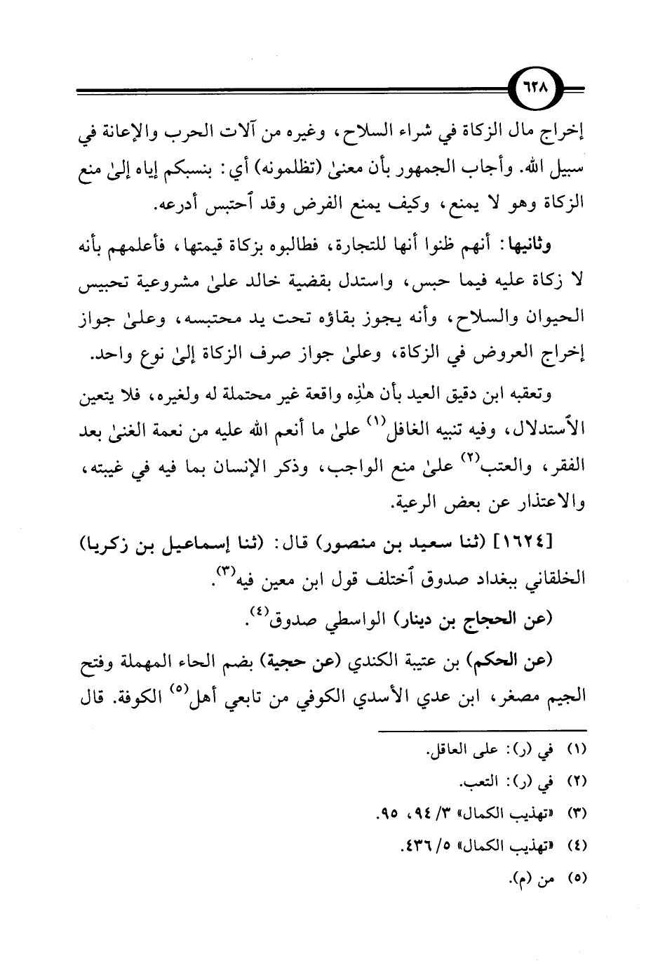 إخراج مال الزكاة في شراء السلاح، وغيره من آلات الحرب والإعانة في سبيل الله. وأجاب الجمهور بأن معنى (تظلمونه) أي: بنسبكم إياه إلى منع الزكاة وهو لا يمنع، وكيف يمنع الفرض وقد احتبس أدرعه.