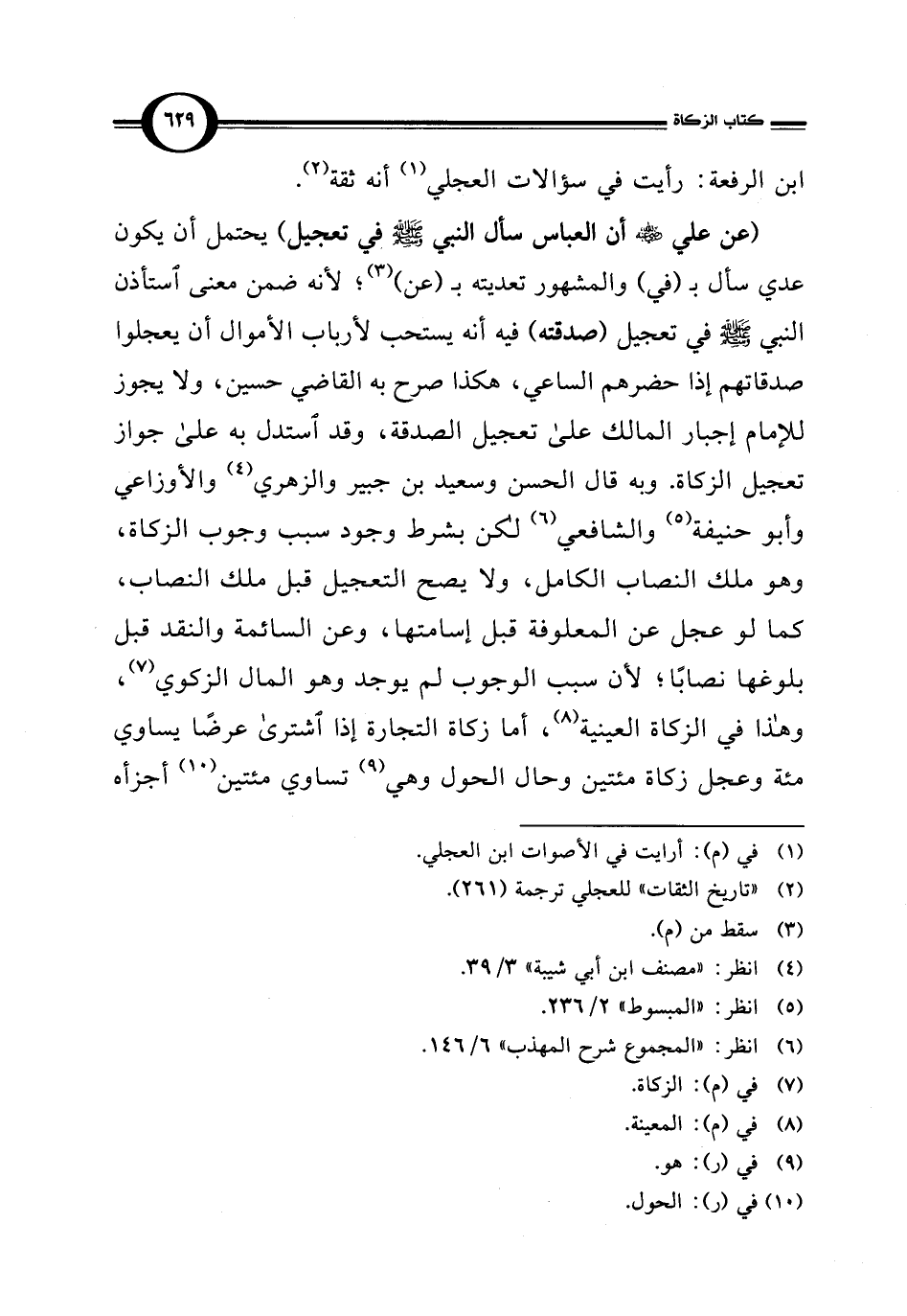 (عن علي - رضي الله عنه - أن العباس سأل النبي - صلى الله عليه وسلم - في تعجيل) يحتمل أن يكون عدي سأل بـ (في) والمشهور تعديته بـ (عن) (¬3)؛ لأنه ضمن معنى استأذن النبي - صلى الله عليه وسلم - في تعجيل (صدقته) فيه أنه يستحب لأرباب الأموال أن يعجلوا صدقاتهم إذا حضرهم الساعي، هكذا صرح به القاضي حسين، ولا يجوز للإمام إجبار المالك على تعجيل الصدقة، وقد استدل به على جواز تعجيل الزكاة. وبه قال الحسن وسعيد بن جبير والزهري (¬4) والأوزاعي وأبو حنيفة (¬5) والشافعي (¬6) لكن بشرط وجود سبب وجوب الزكاة، وهو ملك النصاب الكامل، ولا يصح التعجيل قبل ملك النصاب، كما لو عجل عن المعلوفة قبل إسامتها، وعن السائمة والنقد قبل بلوغها نصابًا؛ لأن سبب الوجوب لم يوجد وهو المال الزكوي (¬7)، وهذا في الزكاة العينية (¬8)، أما زكاة التجارة إذا اشترى عرضًا يساوي مئة وعجل زكاة مئتين وحال الحول وهي (¬9) تساوي مئتين (¬10) أجزأه
