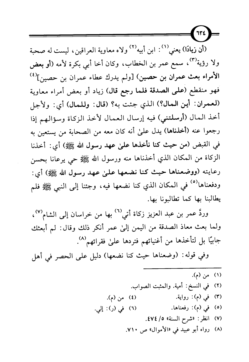 (أن زيادًا) يعني (¬1): ابن أبيه (¬2) ولاه معاوية العراقين، ليست له صحبة ولا رؤية (¬3)، سمع عمر بن الخطاب، وكان أخا أبي بكرة لأمه (أو بعض الأمراء بعث عمران بن حصين) [ولم يدرك عطاء عمران بن حصين] (¬4) فهو منقطع (على الصدقة فلما رجع قال) زياد أو بعض أمراء معاوية (لعمران: أين المال؟ ) الذي جئت به؟ (قال: وللمال) أي: ولأجل أخذ المال (أرسلتني) فيه إرسال العمال لأخذ الزكاة وسؤالهم إذا رجعوا عنه (أخذناها) يدل على أنه كان معه من الصحابة من يستعين به في القبض (من حيث كنا نأخذها على عهد رسول الله - صلى الله عليه وسلم -) أي: أخذنا الزكاة من المكان الذي أخذناها منه ورسول الله - صلى الله عليه وسلم - حي يرعانا بحسن رعايته (ووضعناها حيث كنا نضعها على عهد رسول الله - صلى الله عليه وسلم -) أي: ودفعناها (¬5) في المكان الذي كنا نضعها فيه، وجئنا إلى النبي - صلى الله عليه وسلم - فلم يطالبنا بها كما تطالبونا بها.