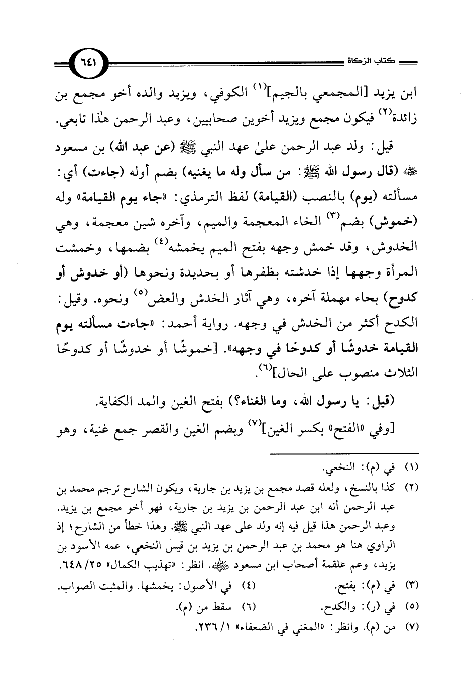 قيل: ولد عبد الرحمن على عهد النبي - صلى الله عليه وسلم - (عن عبد الله) بن مسعود - رضي الله عنه - (قال رسول الله - صلى الله عليه وسلم -: من سأل وله ما يغنيه) بضم أوله (جاءت) أي: مسألته (يوم) بالنصب (القيامة) لفظ الترمذي: "جاء يوم القيامة" وله (خموش) بضم (¬3) الخاء المعجمة والميم، وآخره شين معجمة، وهي الخدوش، وقد خمش وجهه بفتح الميم يخمشه (¬4) بضمها، وخمشت المرأة وجهها إذا خدشته بظفرها أو بحديدة ونحوها (أو خدوش أو كدوح) بحاء مهملة آخره، وهي آثار الخدش والعض (¬5) ونحوه. وقيل: الكدح أكثر من الخدش في وجهه. رواية أحمد: "جاءت مسألته يوم القيامة خدوشًا أو كدوحًا في وجهه". [خموشًا أو خدوشًا أو كدوحًا الثلاث منصوب على الحال] (¬6).